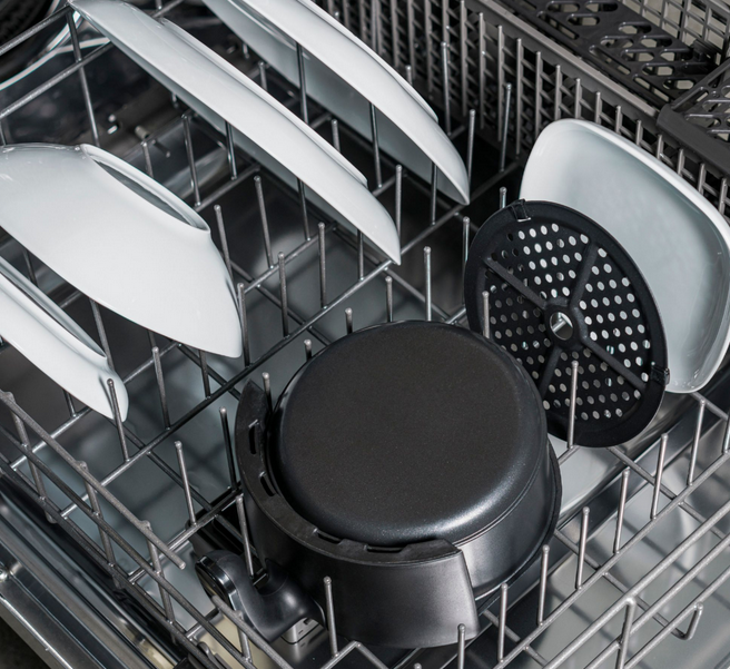 The PFOA-free non-stick pan and crisping tray are dishwasher safe.