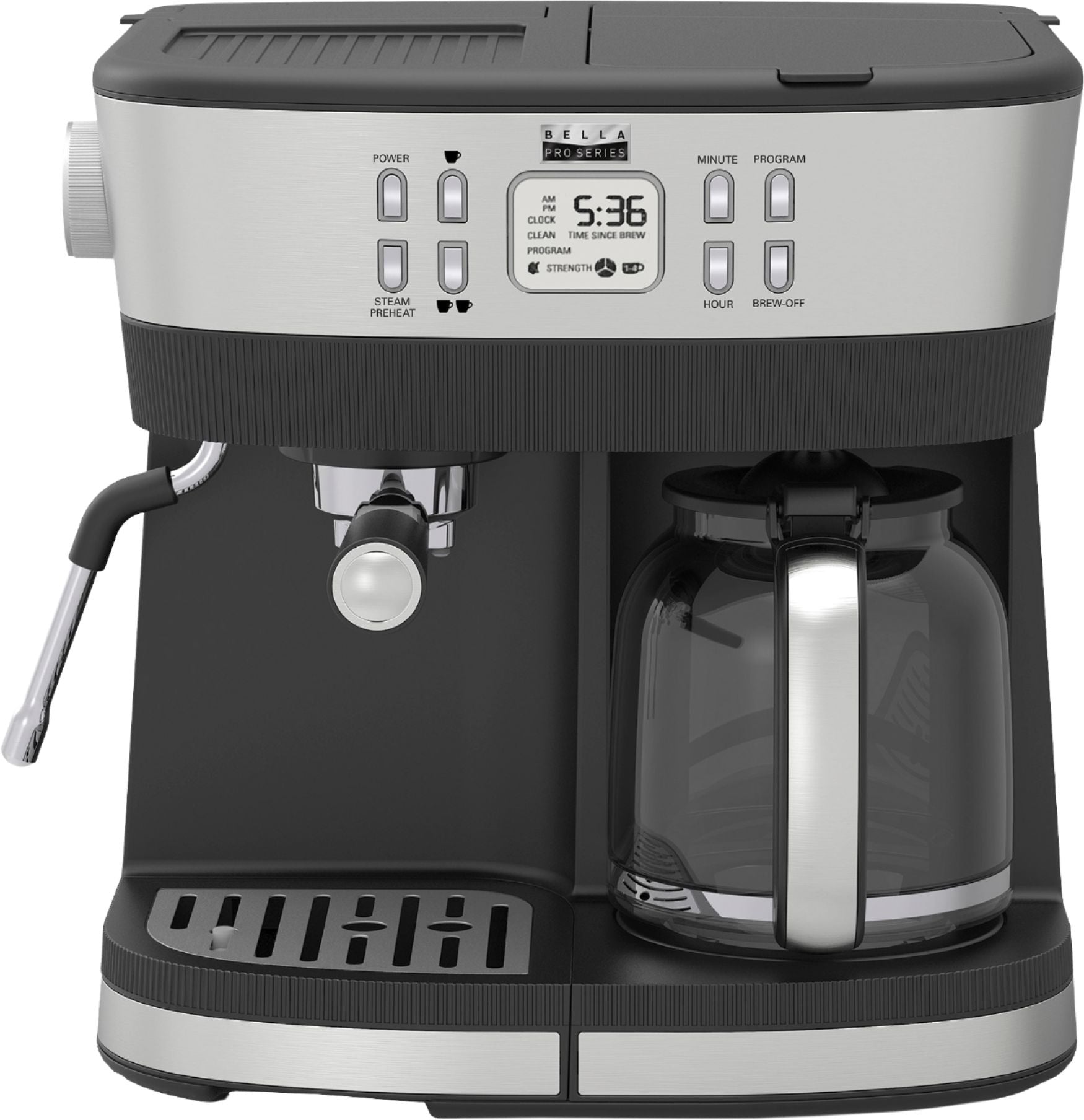 Be your own barista with the Bella Pro Series Combo 19-Bar Espresso & 10-Cup Drip Coffee Maker. This 2-in-1 kitchen staple offers espressos, cappuccinos, lattes, and drip coffee with the touch of a button. 19-bar pressure provides rich and smooth espresso with an adjustable knob to switch between Espresso, Steam, and Off. Easy to use steam wand quickly heats and froths milk with removable cover for easy cleaning. Removable drip tray and reusable scoop with tamper included. The 10-cup drip coffee maker is programmable up to 24 hours in advance with a keep warm feature for added convenience. Indicator lights for hassle free operation, easy flow carafe spout, and removable and reusable permanent gold-tone filter included.