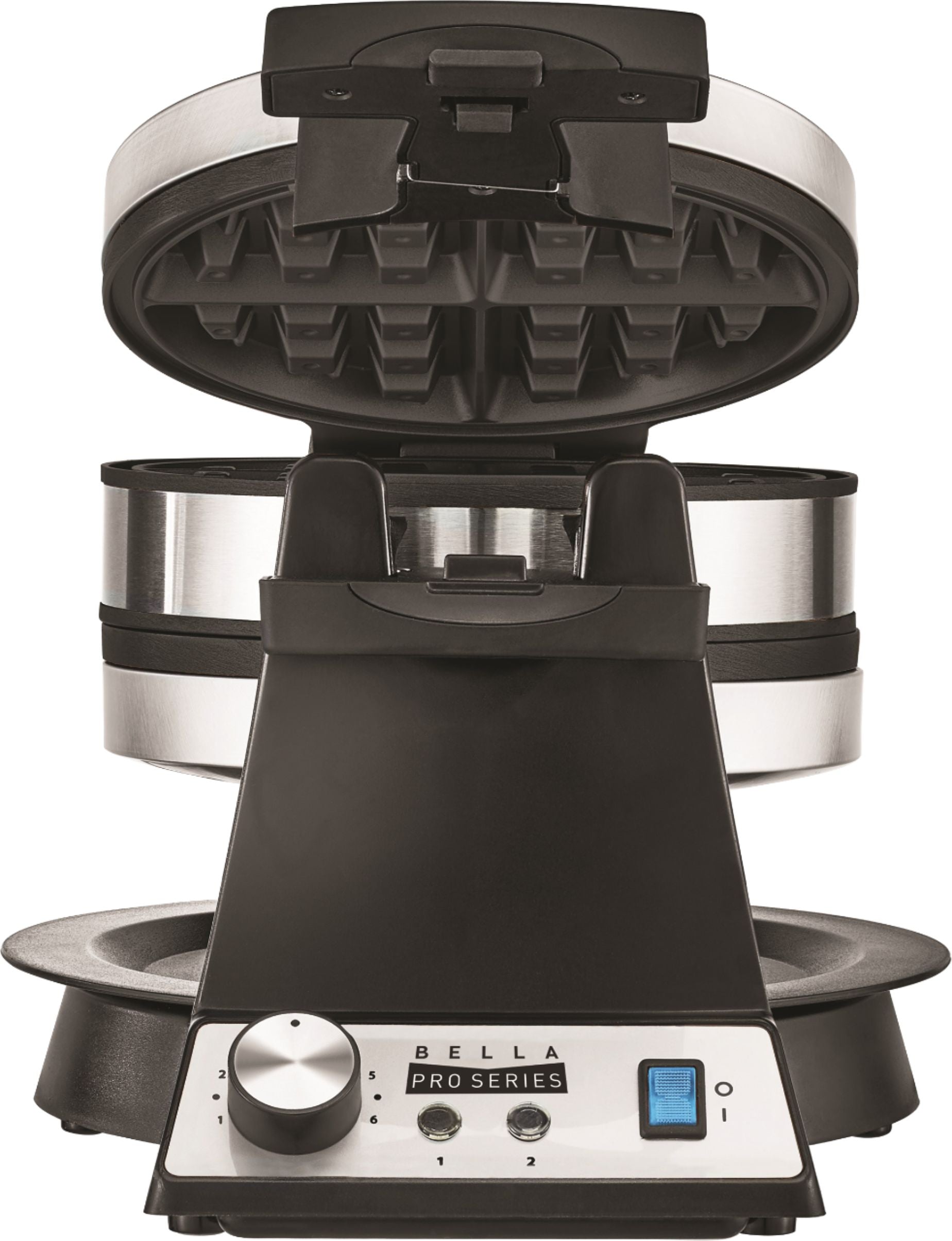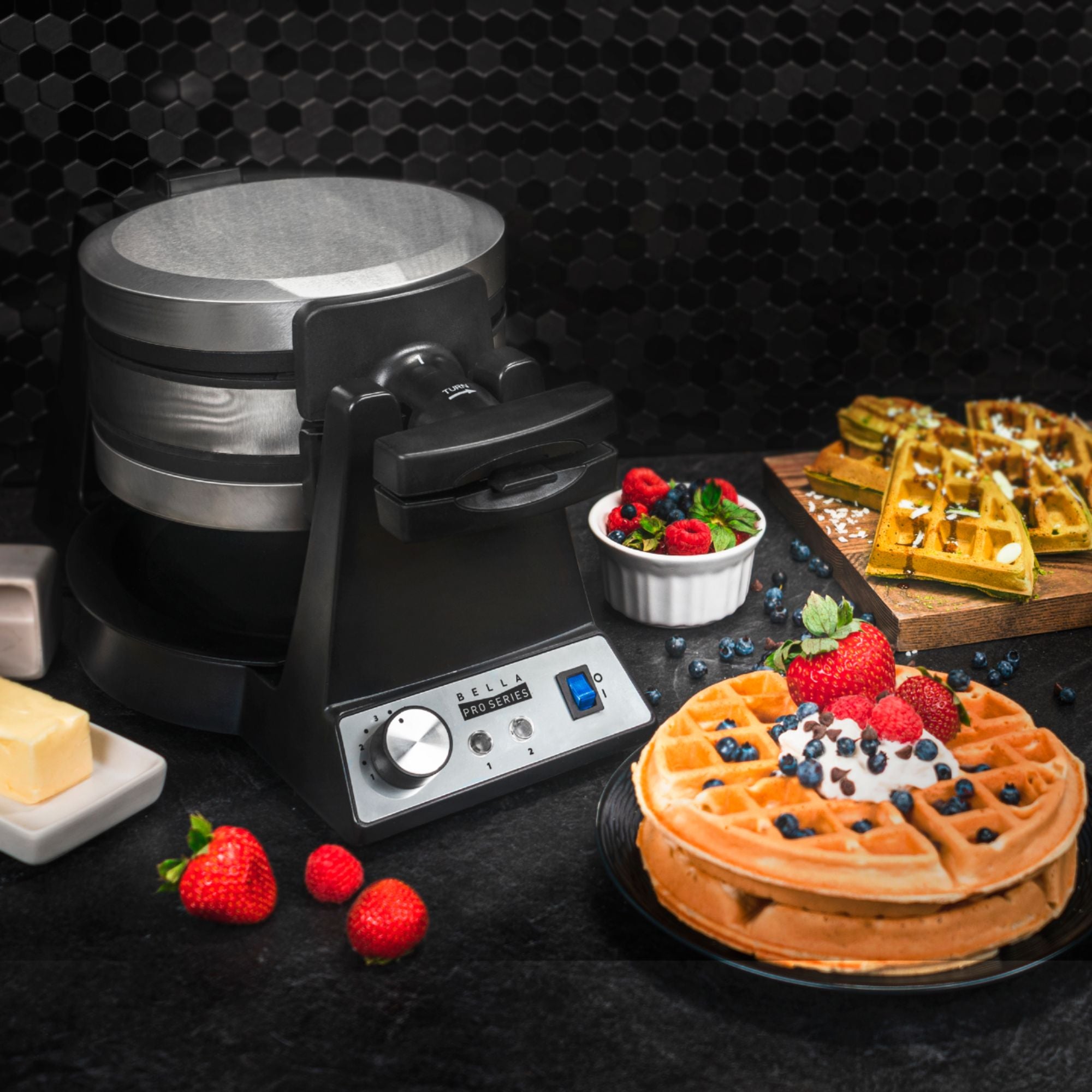 Serve tasty breakfasts to friends and family with this BELLA Pro double rotating waffle maker. The rotating design helps ensure even cooking, while the premeasured batter cup prevents overfilling. This BELLA Pro double rotating waffle maker features a drip tray that's dishwasher safe for easy cleaning, and the cord wraps up for simple storage.