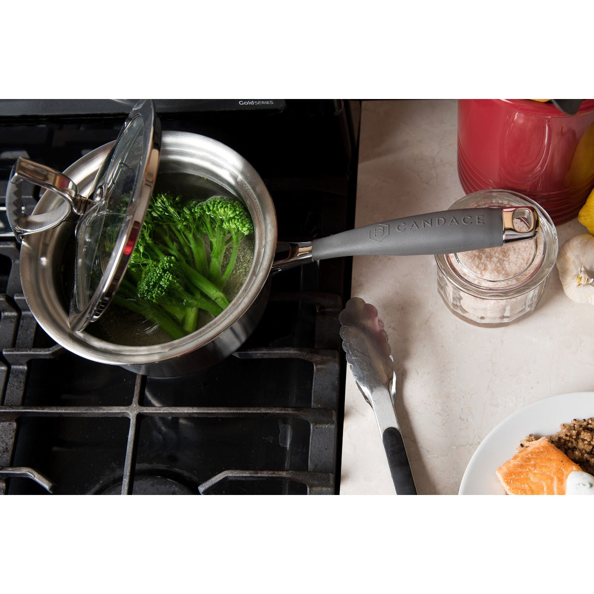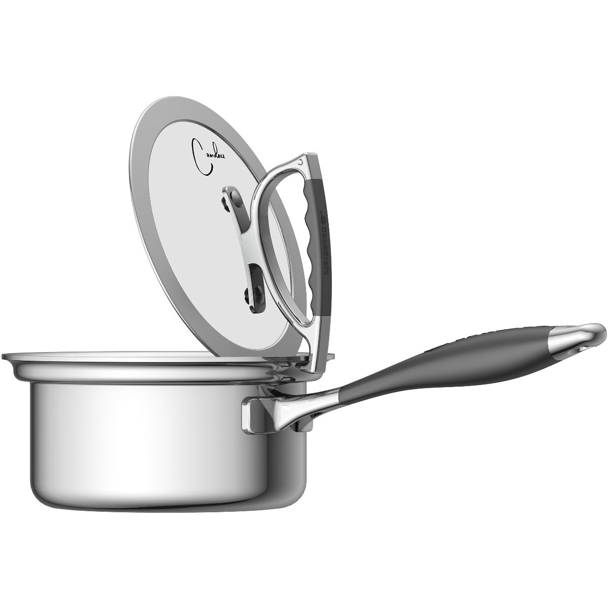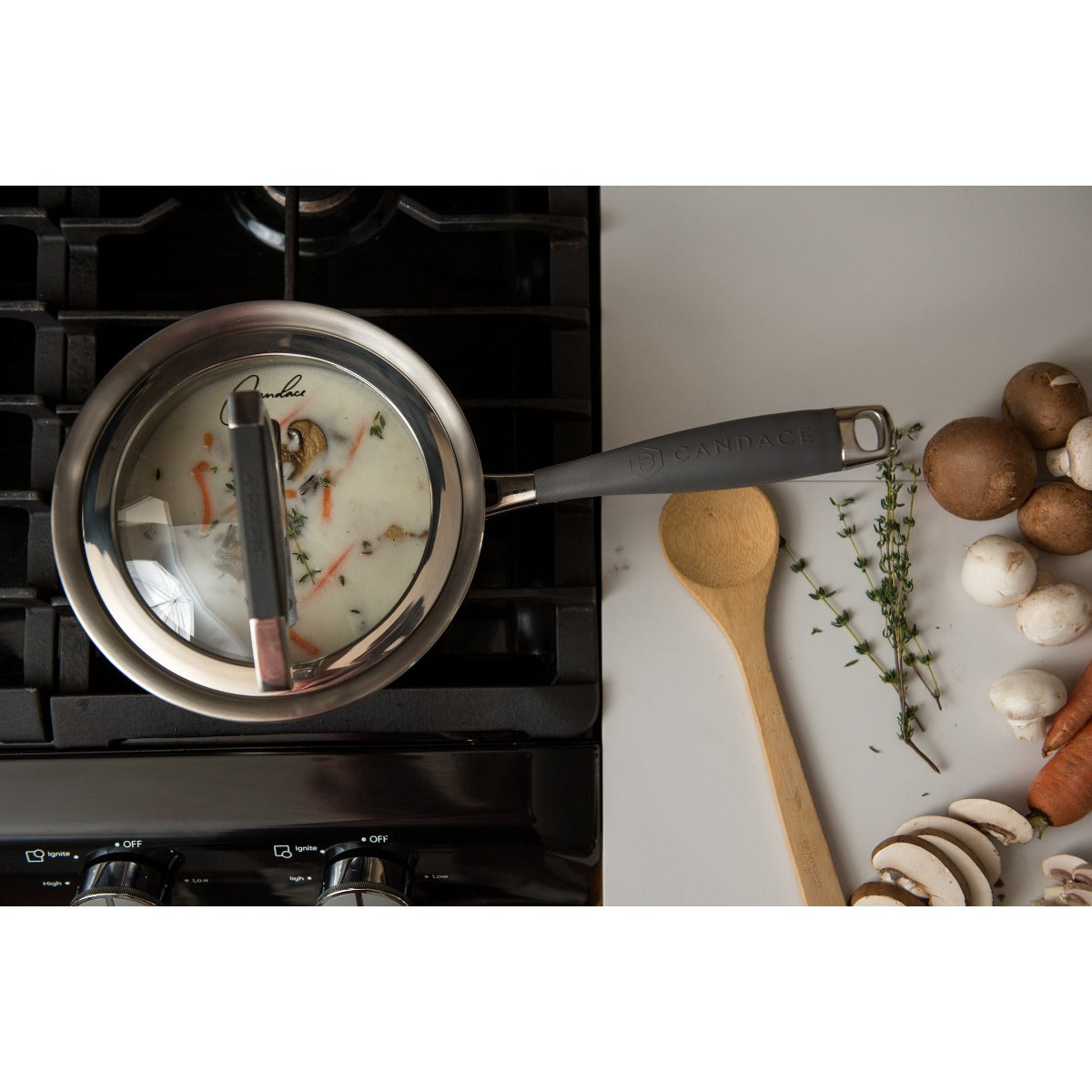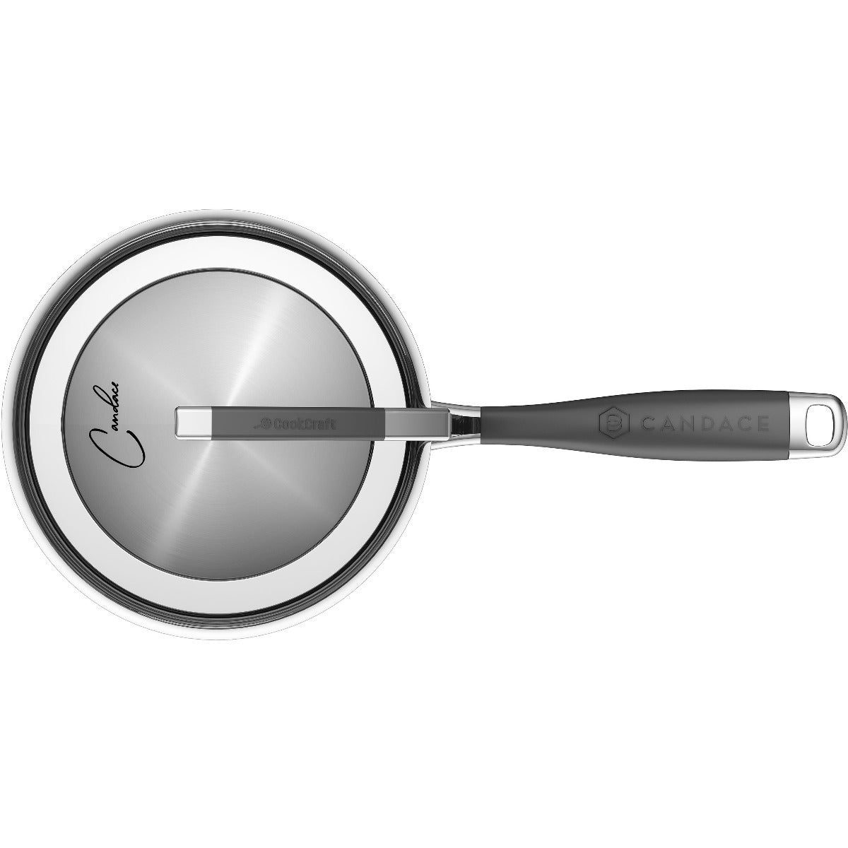 Luxurious CookCraft by Candace presents durable, high-quality cookware for the home chef who loves to create delicious culinary delights for loved ones to enjoy. Sturdy yet stylish, this long-lasting innovative cookware features a beautiful brushed finish with mirror-like accents, convenient glass lids so you can see the food as it?s cooking, and CookCraft's unique patented latch lid that hooks on the rim of the pan, keeping your countertop spotless! Can your lid do this? This restaurant-quality cookware boasts a modern tri-ply design combining the durability of stainless steel with the excellent heat distribution properties of an aluminum core for professional results. Sleek silicone handles help prevent unnecessary burns and provide a secure, comfortable grip for ultimate control. Whether you want to cook a family-style meal or treat your friends to a fine-dining experience in your home, this versatile cookware will help you impress your guests. Savor the memories!