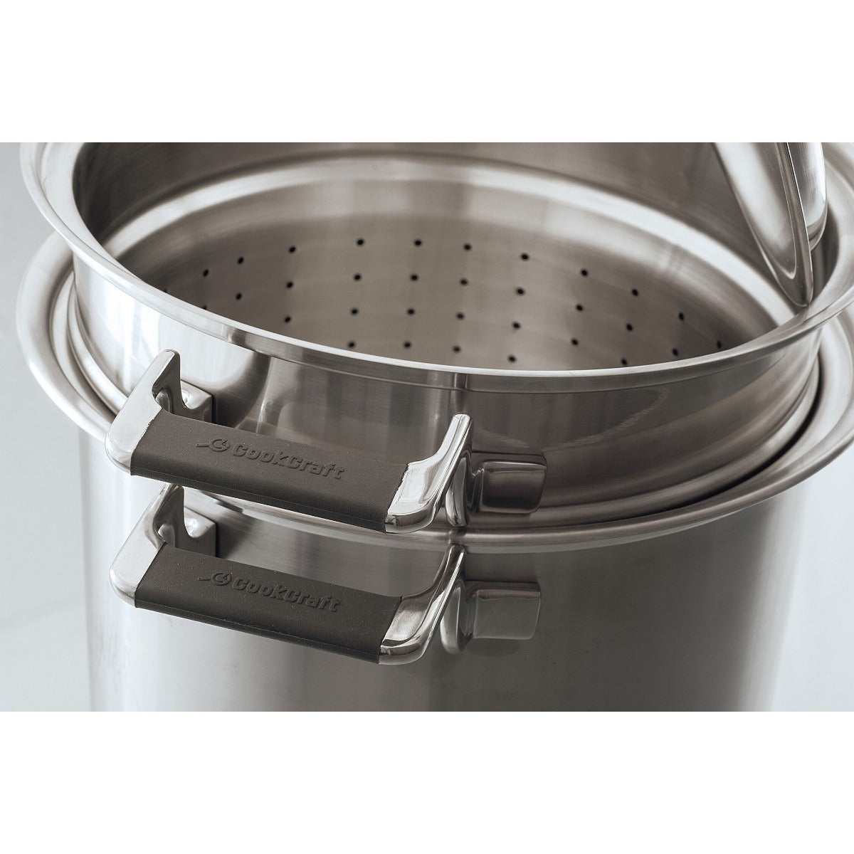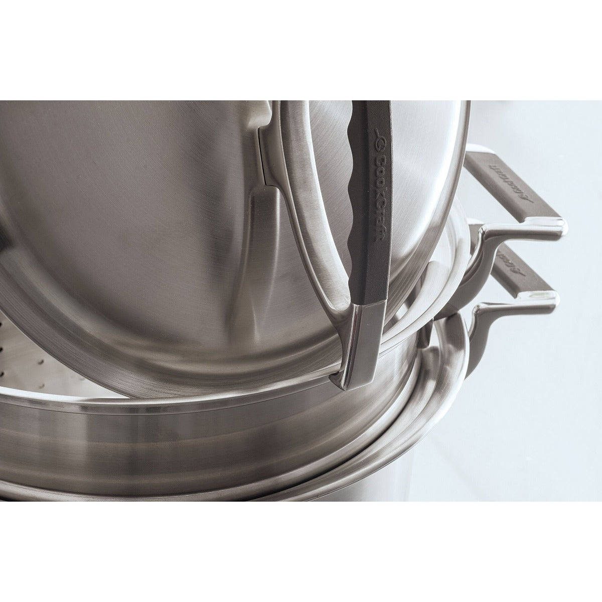 Inspired by chefs from around the world, we are proud to introduce luxurious CookCraft cookware! Our unique CookCraft Original line features durable, high-quality cookware for the everyday chef who loves to cook delicious food for family and friends. Impress your guests with a fine-dining experience of culinary delights - restaurant quality right at home! Sturdy yet stylish, this versatile cookware is long-lasting and backed by a 10-year warranty. The modern tri-ply design combines the durability of stainless steel with the excellent heat distribution properties of an aluminum core for professional results. Sleek silicone handles provide a secure, comfortable grip for ultimate cooking control. Plus, our innovative lid features a convenient latch handle that rests on the rim of the pan to reduce clutter, heat rings, and mess on your countertop. Can your lid do this?