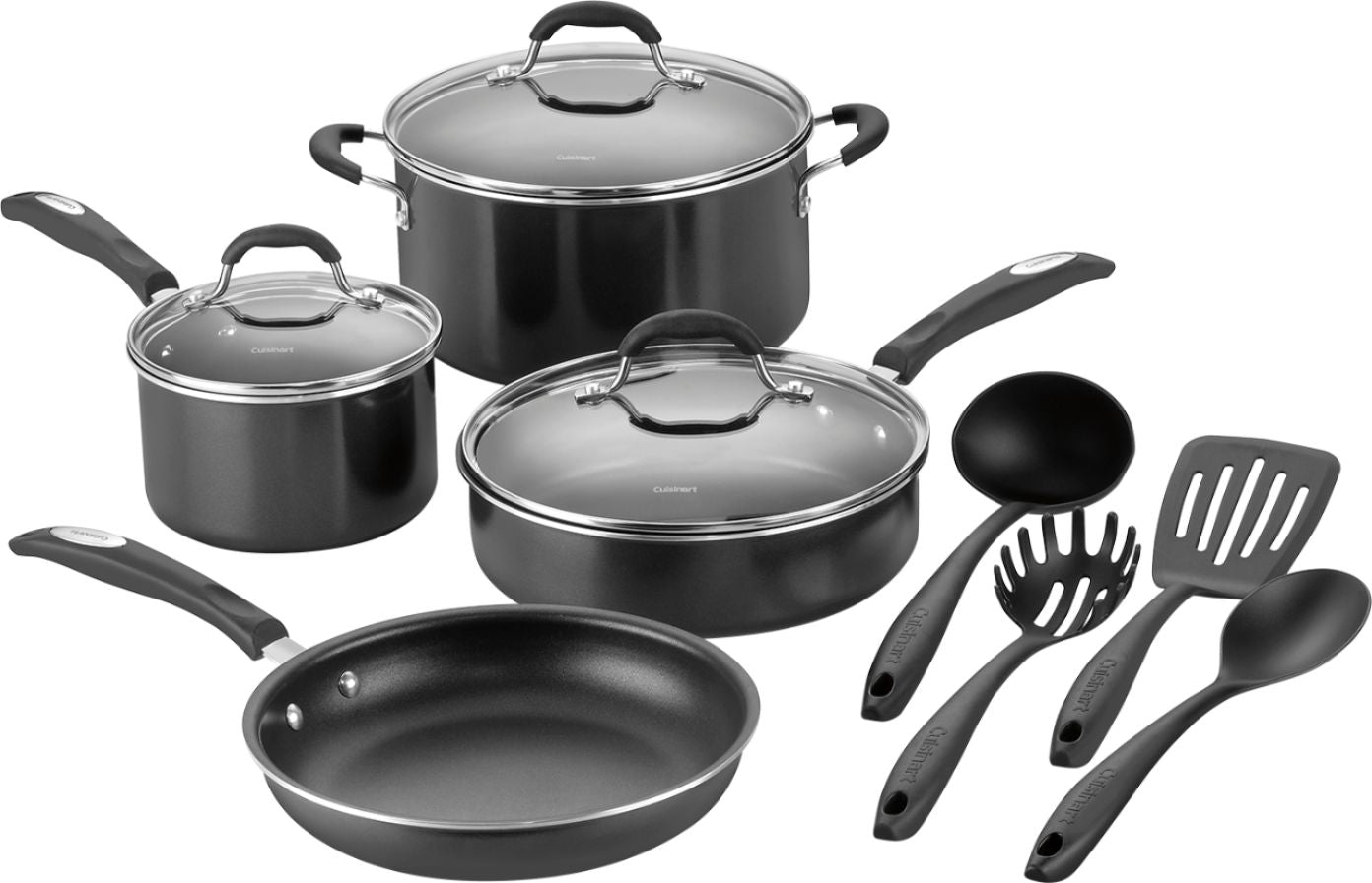 Whip up meals quickly with this Cuisinart nonstick cooking set. With 11 pieces, including four pans and a skillet, this set is ideal for cooking soup stock, searing meat and sauteing vegetables, and the four kitchen tools add versatility when preparing pasta or turning eggs. The triple base layers of the pots in this Cuisinart nonstick cooking set provide excellent heat conduction.