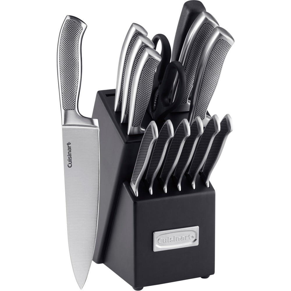 Keep the right knife close at hand with this 15-piece Cuisinart Graphix collection. It includes six kitchen knives that chop, slice, dice and pare, as well as six steak knives. Kitchen shears, a sharpening steel and knife block round out the set. Made with stainless steel blades and textured grips, this Cuisinart Graphix collection makes meal prep simple.