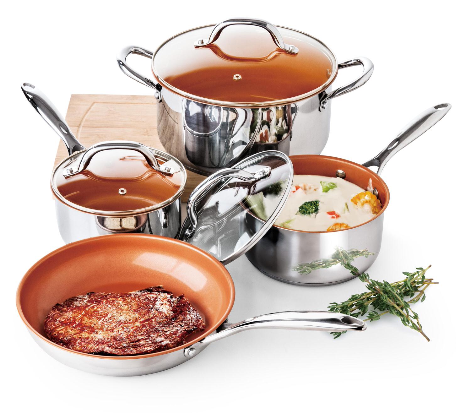 Made of high-quality stainless steel Riveted Cast Stainless steel handle and knob 3mm Encapsulated Bottom 5-IN-1 Cookware Stove-Top&Oven Use Electric Gas Ceramic Induction PFOA/PTFE Free No Oil or Butter Needed Fast/Even Heating Ceramic infused copper fry pan Can be used for: Saute, Broil, Fry, Braise, Bake. Oven Safe up to 550F