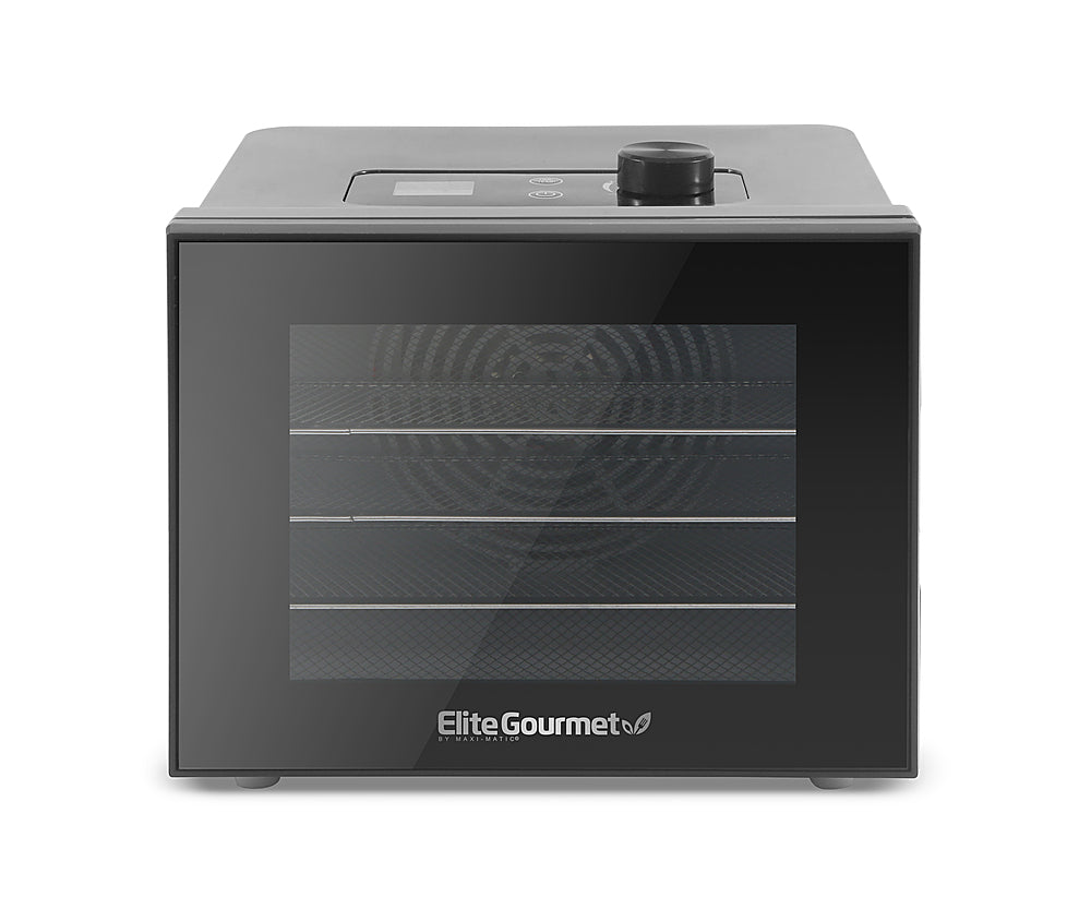 Save money and time by creating your own healthy snacks quickly and easily at home with the Elite Gourmet 4 stainless steel tray snack maker food Dehydrator. It's sleek, compact and contemporary design features 350 watts of drying power, and generates maximum speed and quality for Dehydrating fruits, vegetables, and jerky. It's never been so easy to whip up a batch of banana, apple or kale chips or dry your favorite vegetables, herbs and even flowers! features a swing-out door W/ clear viewing window to watch drying progress and a digital control panel W/ adjustable timer and temperature buttons. Includes dishwasher safe parts: 4 removable stainless steel dehydrating trays measuring at 9.3" x 7.1".