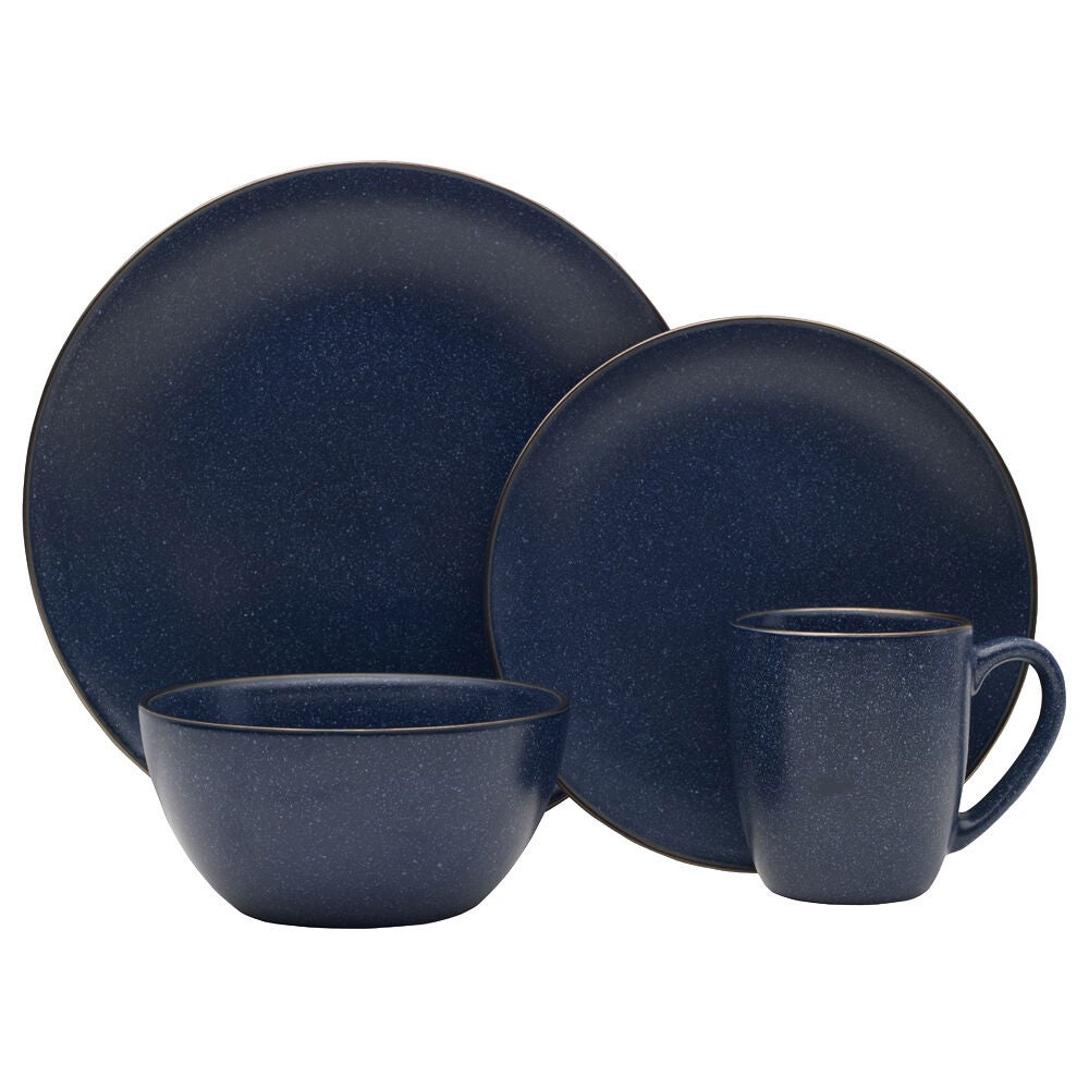 Gourmet Basics Juliana Blue 16pc Dinnerware SetJuliana Blue offers understated elegance to any tabletop. High-quality stoneware with modern shapes and clean lines. Deep blue bodies with a unique stone speckle effect. Organic look is enhanced by a striking metallic rim. Contemporary yet timeless design is ideal for everyday use. Microwave and dishwasher safe. Includes: Four 10.25" Dinner plate. Four 8.5" Salad plates. Four 6" Bowls. Four 13oz Mugs.