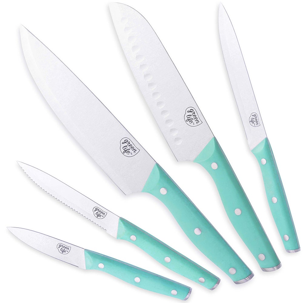 GreenLife cutlery is cutting-edge in design and performance. High carbon stainless steel blades are extra thick for superior stability. Hand ground precision edges and 18-degree blade angle. Comfortable soft grip handle. Stainless steel blades are rust resistant. Sloped bolster supports better control and comfort. Handles add vibrant color to your kitchen. Recommend hand wash only. Includes: 3.5" Paring knife. 5" Serrated knife. 6" Utility knife. 7" Santoku knife. 8" Chef's knife.