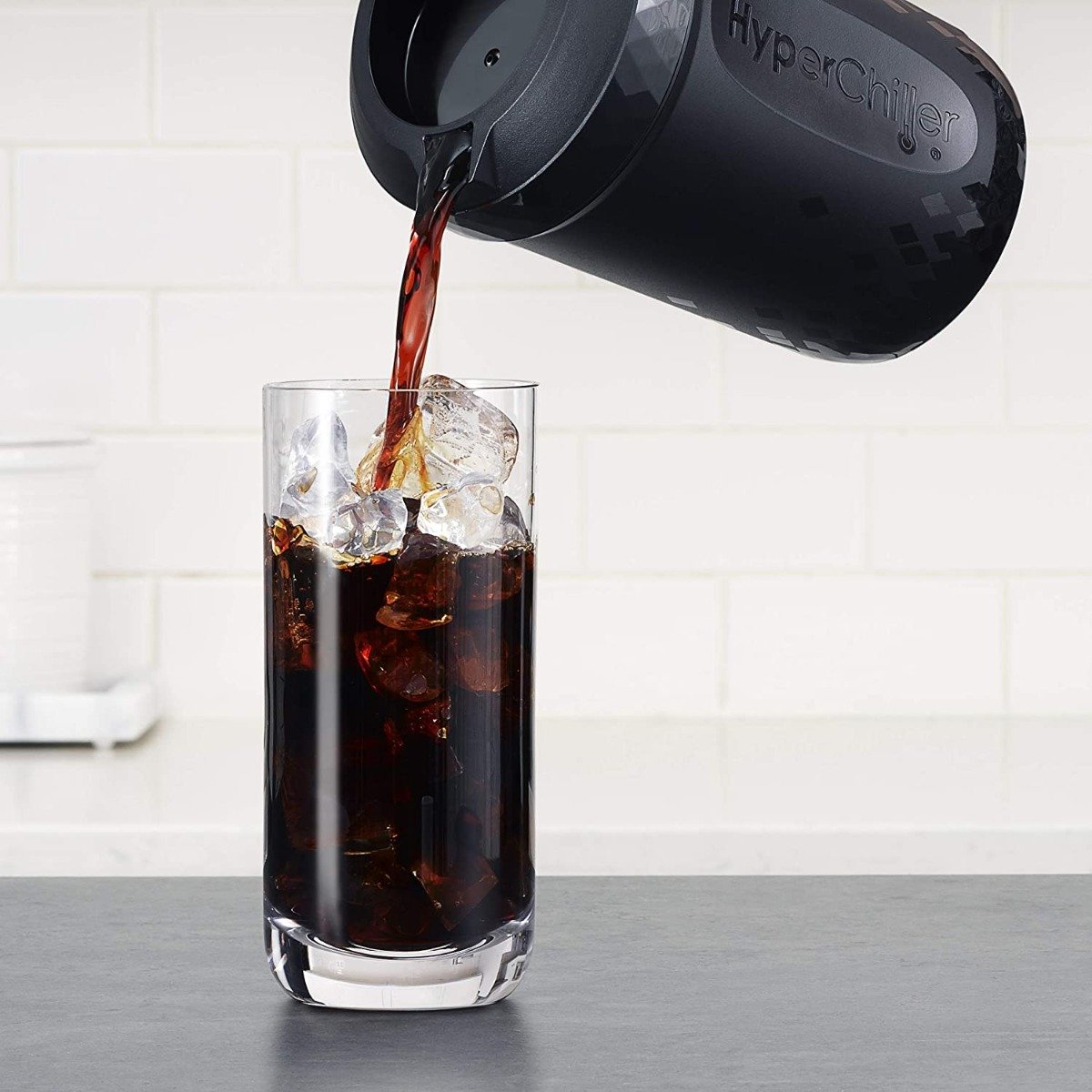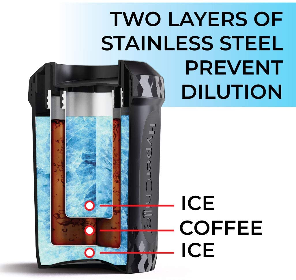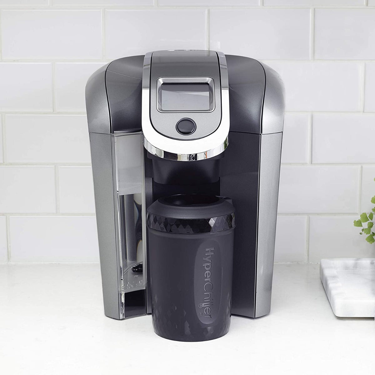 The HyperChiller enables you to turn fresh hot coffee into perfect iced coffee in one minute flat! It fits directly into most full size single serve brewers, and works with all traditional brewing methods as well. Chill more than coffee: whiskey, wine, tea, etc. Flash chills hot coffee by up to 130+ degrees in one minute, with zero dilution. Holds up to 12.5 fluid ounces at once.