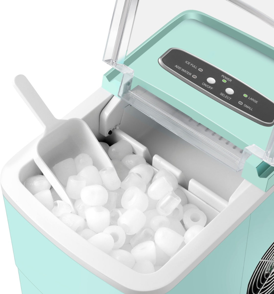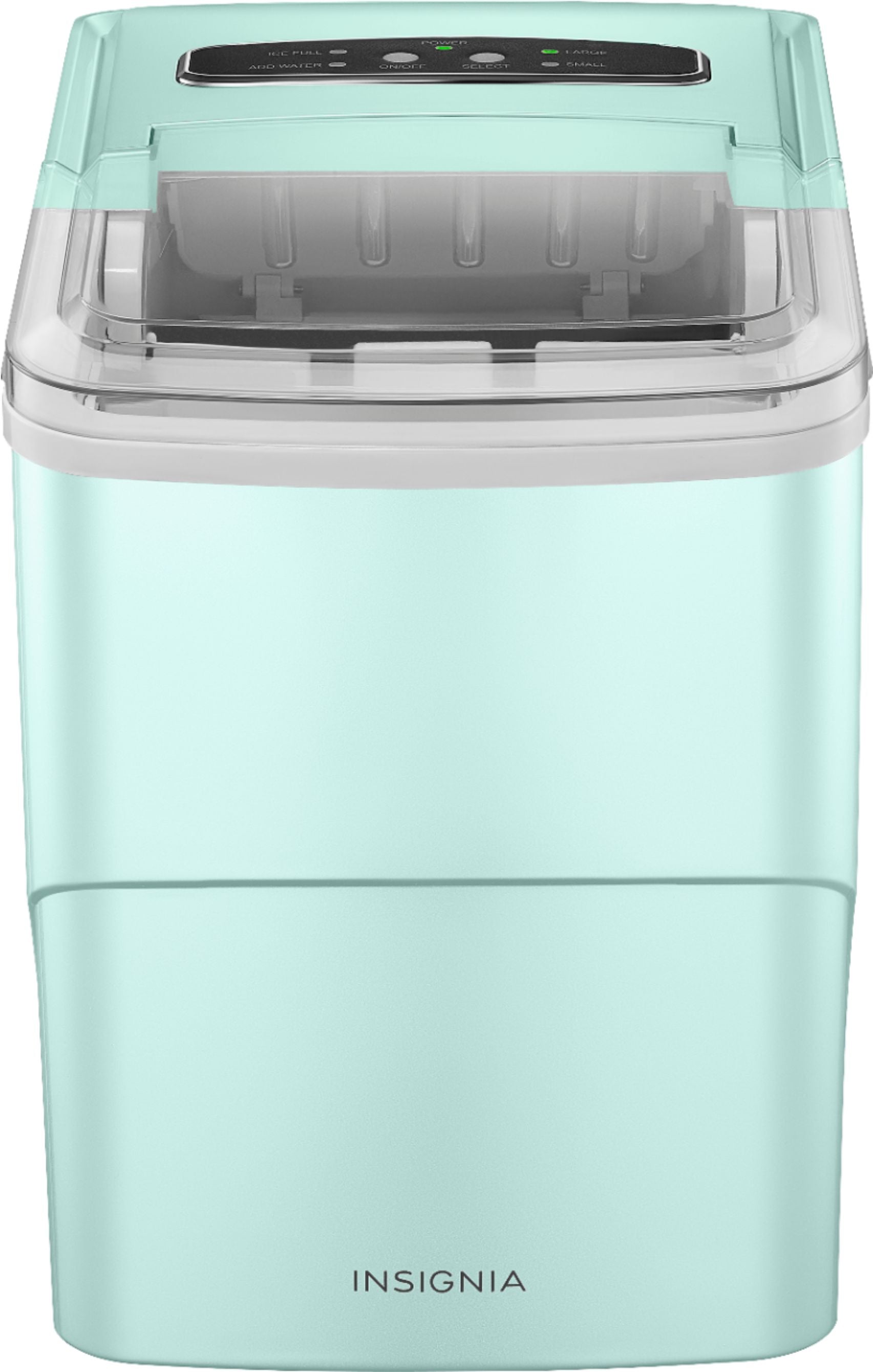 You'll never run out of ice with the Insignia NS-IMP26MT2 26 Lb. Portable Icemaker with Auto Shut-Off. Producing up to 26 lbs. of ice per day, this icemaker stores up to 1.5 lbs., supplying all the cold drinks at a large gathering. It creates ice every 6 to 13 minutes and has two cube size options you can choose from, depending on your drink of choice and glass size. It has a large 2.1-quart water tank that recycles melted ice, so you can refill it less often. An electronic control panel with indicator lights make this portable icemaker easy to operate. Match the icemaker to your kitchen decor or add an interesting pop of color with a mint green that will attract all your guests. Become the best party host with a portable icemaker that keeps up with the drinks and your guests' expectations.