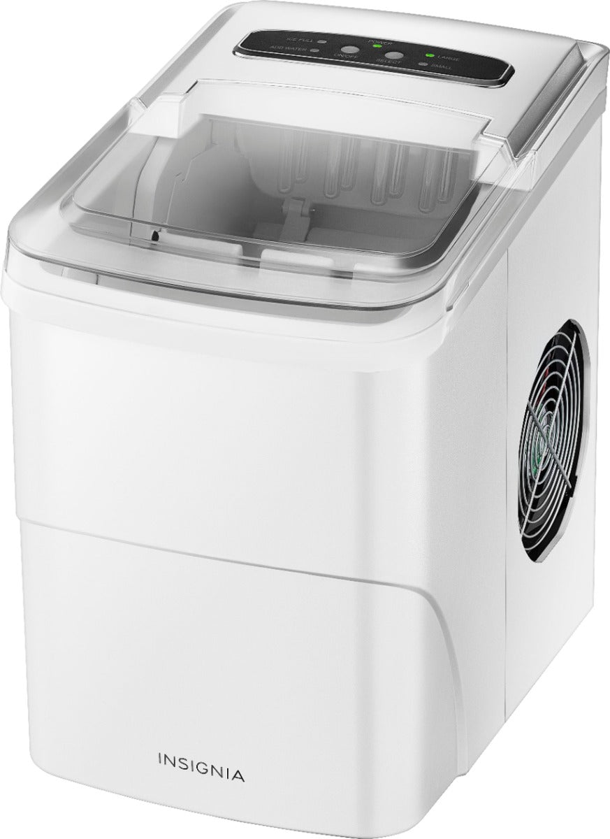 You'll never run out of ice with the Insignia NS-IMP26WH2 26 Lb. Portable Icemaker with Auto Shut-Off. Producing up to 26 lbs. of ice per day, this icemaker stores up to 1.5 lbs., supplying all the cold drinks at a large gathering. It creates ice every 6 to 13 minutes and has two cube size options you can choose from, depending on your drink of choice and glass size. It has a large 2.1-quart water tank that recycles melted ice, so you can refill it less often. An electronic control panel with indicator lights make this portable icemaker easy to operate. Match the icemaker to your kitchen decor with a classic white that will attract all your guests. Become the best party host with a portable icemaker that keeps up with the drinks and your guests' expectations.