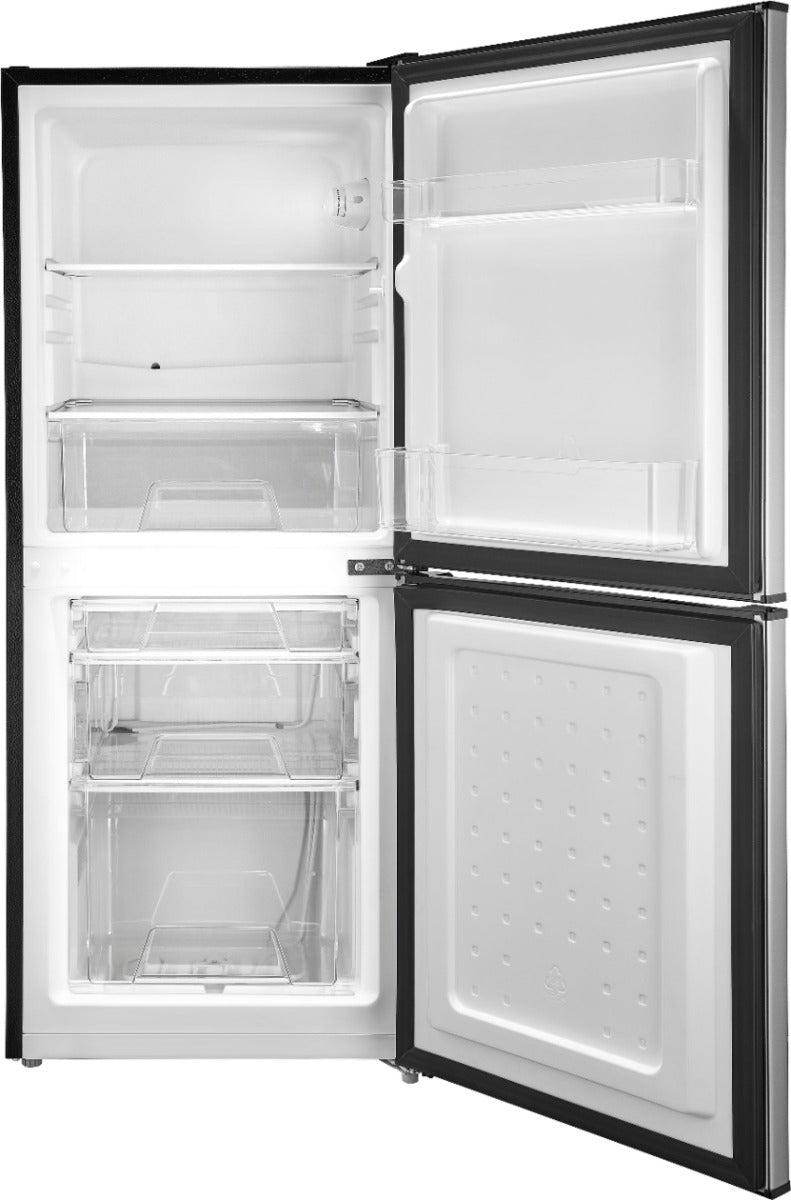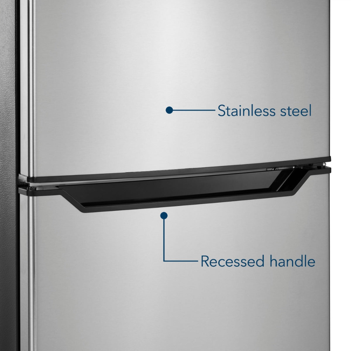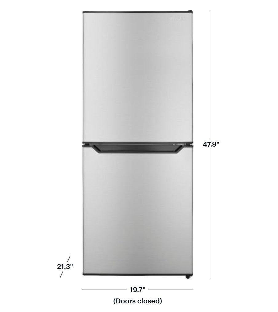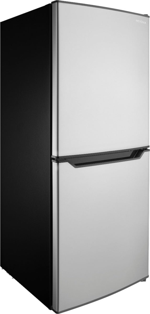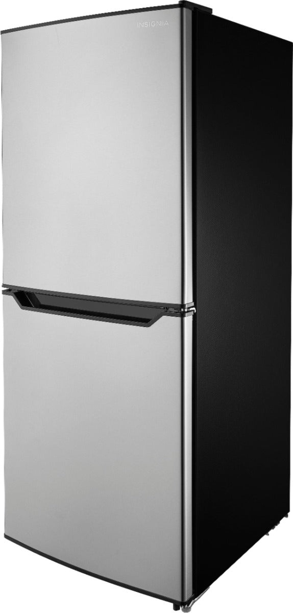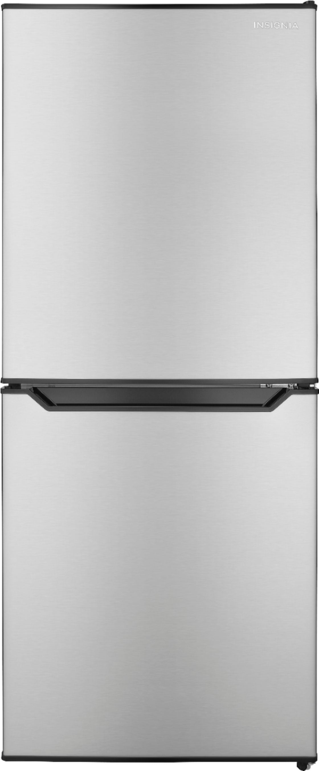 Who says food only belongs in the kitchen? With the Insignia NS-CF49BMSS2 4.9 Cu. Ft. Mini Fridge with Bottom Freezer, food can also be stored in the garage, bedroom, office or dorm. With a separate bottom freezer compartment, you'll have plenty of dedicated space to store your frozen treats and keep them organized in one of the three drawers. The fridge has two shelves to organize your food, with one that adjusts to fit taller items. Door racks comfortably store your bottles and condiments, and the crisper stores fruits and vegetables. The refrigerator is also internally lit so you can find items easily. An easy-to-set temperature dial gives you complete control over your food's temperature. With a modern stainless steel look that's easy to clean, this mini fridge works to keep your food cold, in or out of the kitchen.