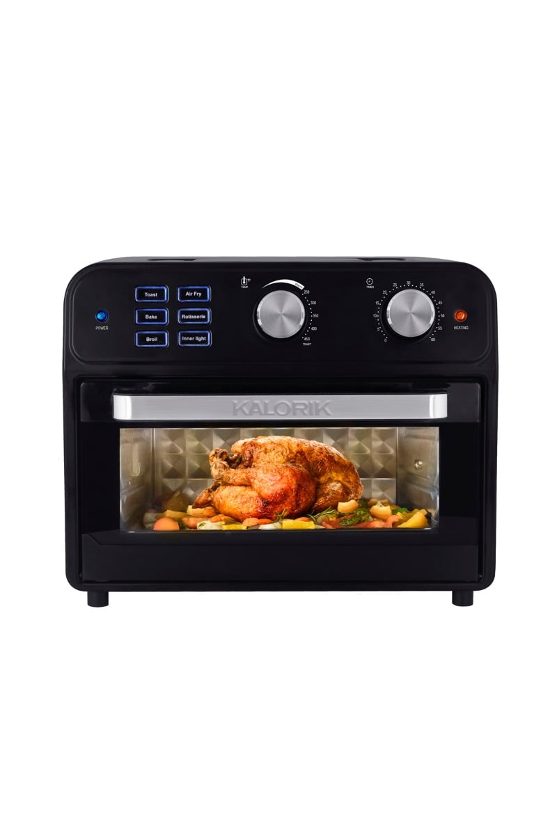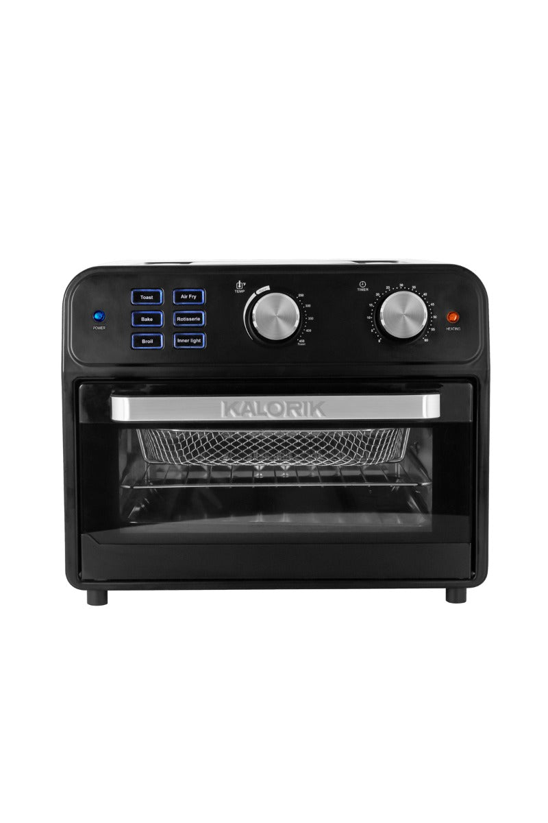 Fry, bake, roast, toast, and broil with the Kalorik 22 Quart Digital Air Fryer Oven. This innovative and multifunctional appliance uses Rapid Hot Air Technology to cook food faster, and make meals healthier. The air frying mechanism works by circulating super hot air around your food, delivering the same crispy texture and rich flavor of your favorite fried foods — without the need for oil. That means less fat and calories. The Kalorik 22 Quart Digital Air Fryer Oven not only functions as an air fryer, it can even be used as your regular, everyday toaster/convection oven. The appliance features chrome-plated knobs and a digital control panel with six functions. These include toast, air fry, bake, rotisserie, broil, and inner light. The unique rotisserie function rotates the included spit accessory during cooking, allowing meat to roast evenly in its own juices and develop maximum flavor. The Kalorik 22 Quart Digital Air Fryer Oven contains six heating elements — four on top, two on the bottom. A built-in 60-minute timer and adjustable temperature up to 450°F let you customize cooking for every dish. Meanwhile, a glass door and oven light allow for easy monitoring. A built-in safety micro switch automatically stops operation when the door is opened. Accessories include a baking pan, air frying basket, air rack, tray handle, crumb tray, rotisserie spit, and rotisserie handle