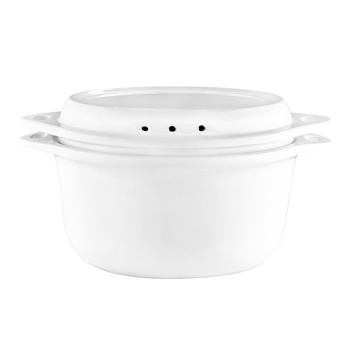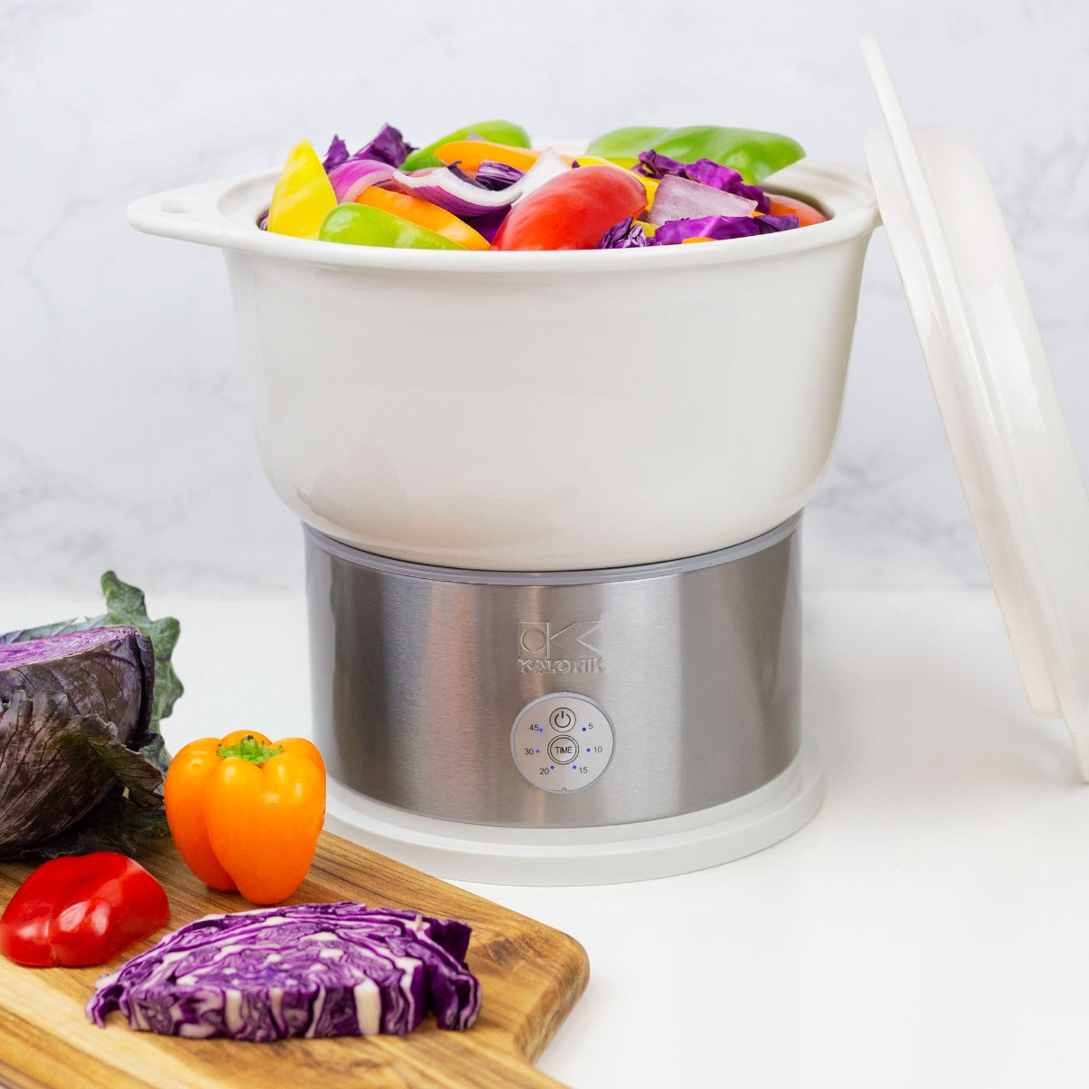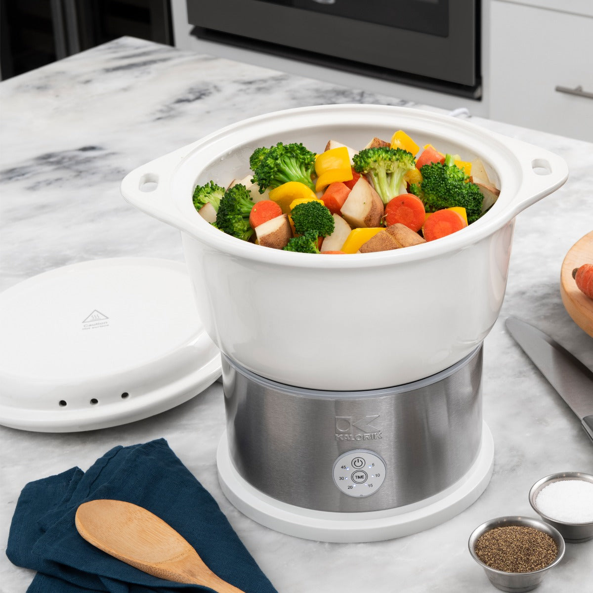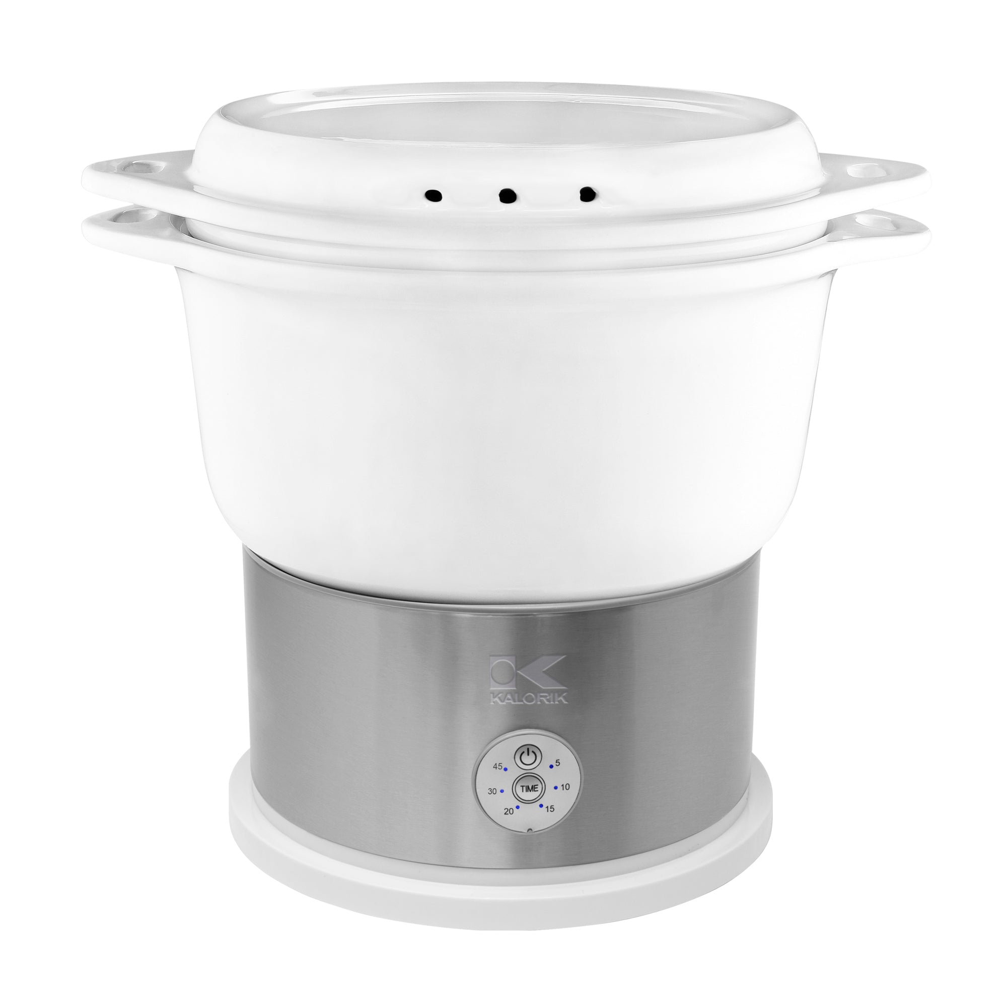Enjoy healthy, perfectly steamed meals, quickly and easily, with the Kalorik 4.8 Quart Ceramic Steamer with Steaming Rack. The BPA-free and lead-free ceramic pot includes a stainless steel steaming rack with a removable handle, allowing you to steam two layers of food simultaneously. The steamer features easy digital controls and an adjustable 45-minute timer. Heat resistant potholders ensure safe handling. The set also comes with a lid, serving platter and drip-tray in one. The base and rack fit neatly inside the pot, for easy, compact storage.