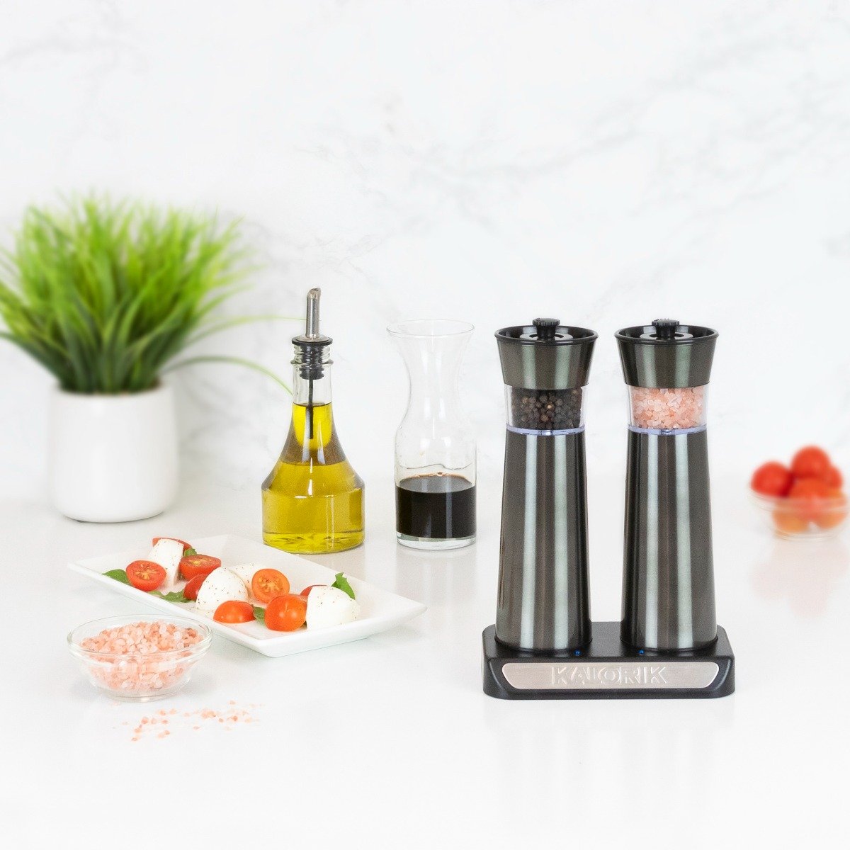 Spice things up in your kitchen with the Kalorik Rechargeable Gravity Salt and Pepper Grinder Set. These high-end electric salt and pepper mills feature stainless steel housing and premium-quality, rust-proof ceramic grinders. Special gravity-activated technology signals the mills to start grinding when you tilt them. With an adjustable grind setting from coarse to extra fine, these electric mills grind sea salt, peppercorns, and a variety of other spices exactly to your liking. Sustainable and economical, the Kalorik Rechargeable Salt and Pepper Grinders help save you money on batteries. The mills sit atop a sleek, low-profile charging base, keeping them charged and ready to grind at all times.