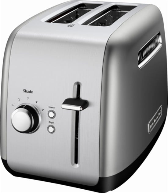 KitchenAid’s KMT2115CU 2-Slice Toaster, in contour silver, has a chrome button that glows with blue back-light illumination when in use. The extra-wide slots will accept the thickest bagels, breads, or pastries and the extra-deep, steel toasting cavity ensures even browning. The racks automatically adjust the slot width for thick or thin slices, keeping food upright for even toasting. When your food is ready, the manual high lift lever makes it easy to get it out of the toaster. Selecting the bagel toasting function reduces the power on one side of the heating elements by 50% to produce a better toasted bagel! Plus, the adjustable 5-shade setting ensures your food will pop up just the way you like it.