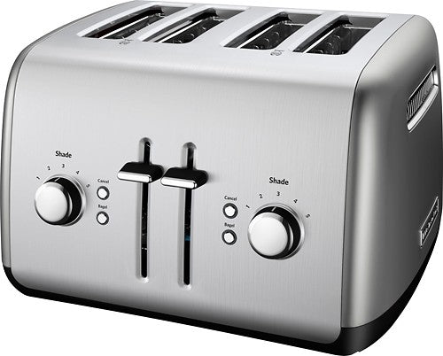 KitchenAid’s KMT4115CU 4-Slice Toaster, in contour silver, has dual independent controls and chrome buttons that glow with blue back-light illumination when in use. The extra-wide slots will accept the thickest bagels, breads, or pastries and the extra-deep, steel toasting cavity ensures even browning. The racks automatically adjust the slot width for thick or thin slices, keeping food upright for even toasting. When your food is ready, the manual high lift lever makes it easy to get it out of the toaster. Selecting the bagel toasting function reduces the power on one side of the heating elements by 50% to produce a better toasted bagel! Plus, the adjustable 5-shade setting ensures your food will pop up just the way you like it.