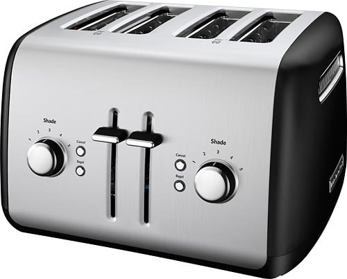 KitchenAid’s KMT4115OB 4-Slice Toaster, in onyx black, has dual independent controls and chrome buttons that glow with blue back-light illumination when in use. The extra-wide slots will accept the thickest bagels, breads, or pastries and the extra-deep, steel toasting cavity ensures even browning. The racks automatically adjust the slot width for thick or thin slices, keeping food upright for even toasting. When your food is ready, the manual high lift lever makes it easy to get it out of the toaster. Selecting the bagel toasting function reduces the power on one side of the heating elements by 50% to produce a better toasted bagel! Plus, the adjustable 5-shade setting ensures your food will pop up just the way you like it.