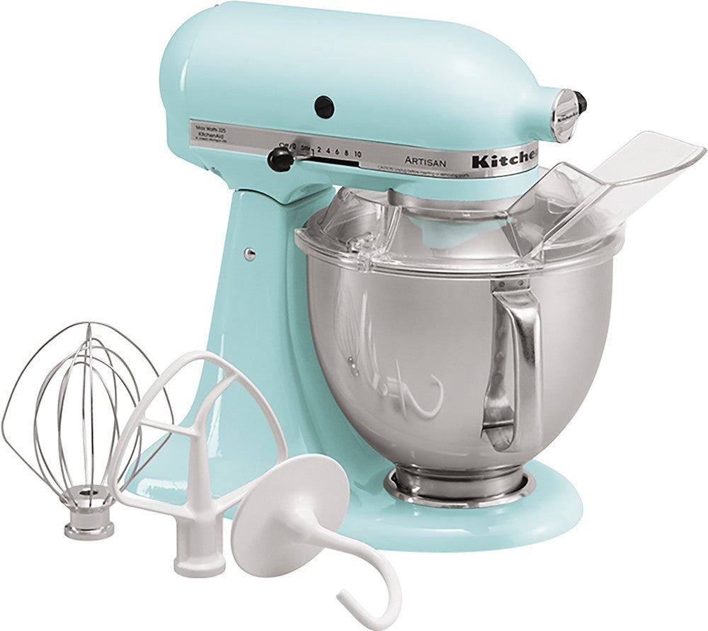 The KitchenAid Artisan Series 325-watt tilt-back head stand mixer is incredibly versatile and more than a mixer. With all the optional attachments (sold separately), you can use it to make homemade pasta, stuff fresh sausage, whip up ice cream, and give fruit a squeeze. This model has a 325-watt motor, 5-quart stainless steel bowl with comfort handle, pouring shield and a tilt-back mixer head design that provides easy access to bowl and beaters. No wonder generations of cooks have cherished theirs. Isn't it your turn?