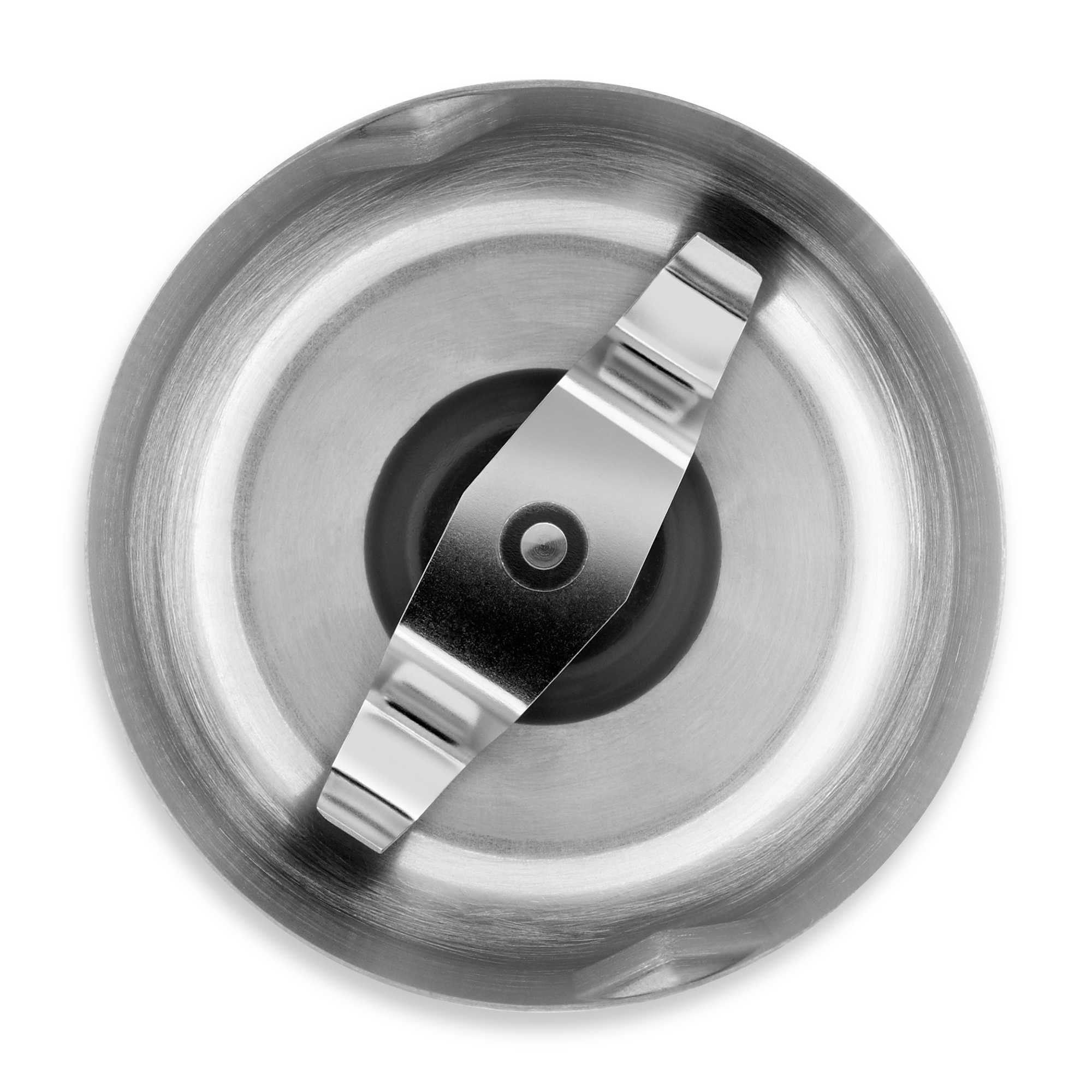 With KitchenAid’s BCG211OB Blade Coffee and Spice Grinder, in onyx black, you get separate grinding bowls for coffee and spices to prevent cross-contamination. This dual-use grinder features a powerful blade grinding mechanism that consists of stainless steel blades driven by a powerful 160-watt motor to grind coffee and spices rapidly with minimum noise. The 4 oz. brushed stainless steel coffee grinding bowl easily holds enough beans to brew up to 12 cups of coffee. The coffee grinding bowl has internal etched measurement markings that display the recommended brew (4, 8, 10 and 12 cups). Two 2-ounce spice grinding bowls include 1 spice grinding lid, 1 shaker lid and 2 storage lids. The clear, top cover gives you one-touch control. Simply push down on the cover to begin grinding and release to stop. The clear cover also allows you to easily see the consistency of grinds. Plus, the heavy-duty motor housing helps keep the grinder stable during operation.