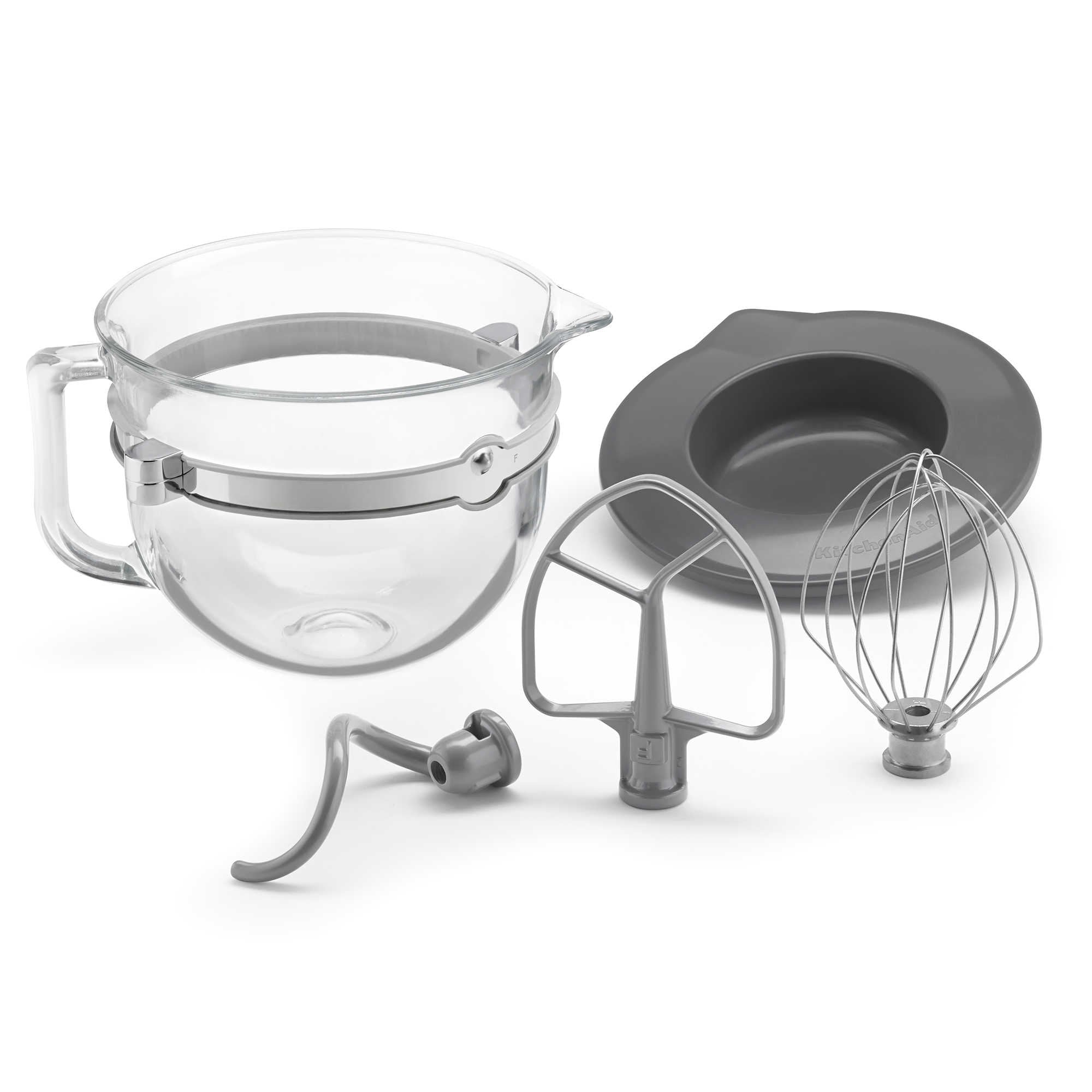 The KitchenAid KSMF6GB F-Series accessory bundle for KitchenAid bowl-lift stand mixers includes the coated flat beater, coated Powerknead spiral dough hook, 6-wire whip, 6-quart reinforced glass bowl with handle, and bowl lid. The coated flat beater quickly and thoroughly mixes potatoes, cake batter, cookie dough and more. The unique spiral design of the coated Powerknead dough hook replicates hand-kneading with a powerful force that kneads 25-percent more yeast bread dough than previous models. The 6-wire whip incorporates the maximum amount of air in whipped mixtures for fluffier whipped cream and angel food cakes. It also rapidly increases airflow into egg mixtures for stiff souffles and rigid meringue peaks. The 6-quart glass bowl with handle, reinforced steel band and lid is perfect for heavy mixing. KitchenAid's F-Series accessory bundle will meet all your mixing needs.