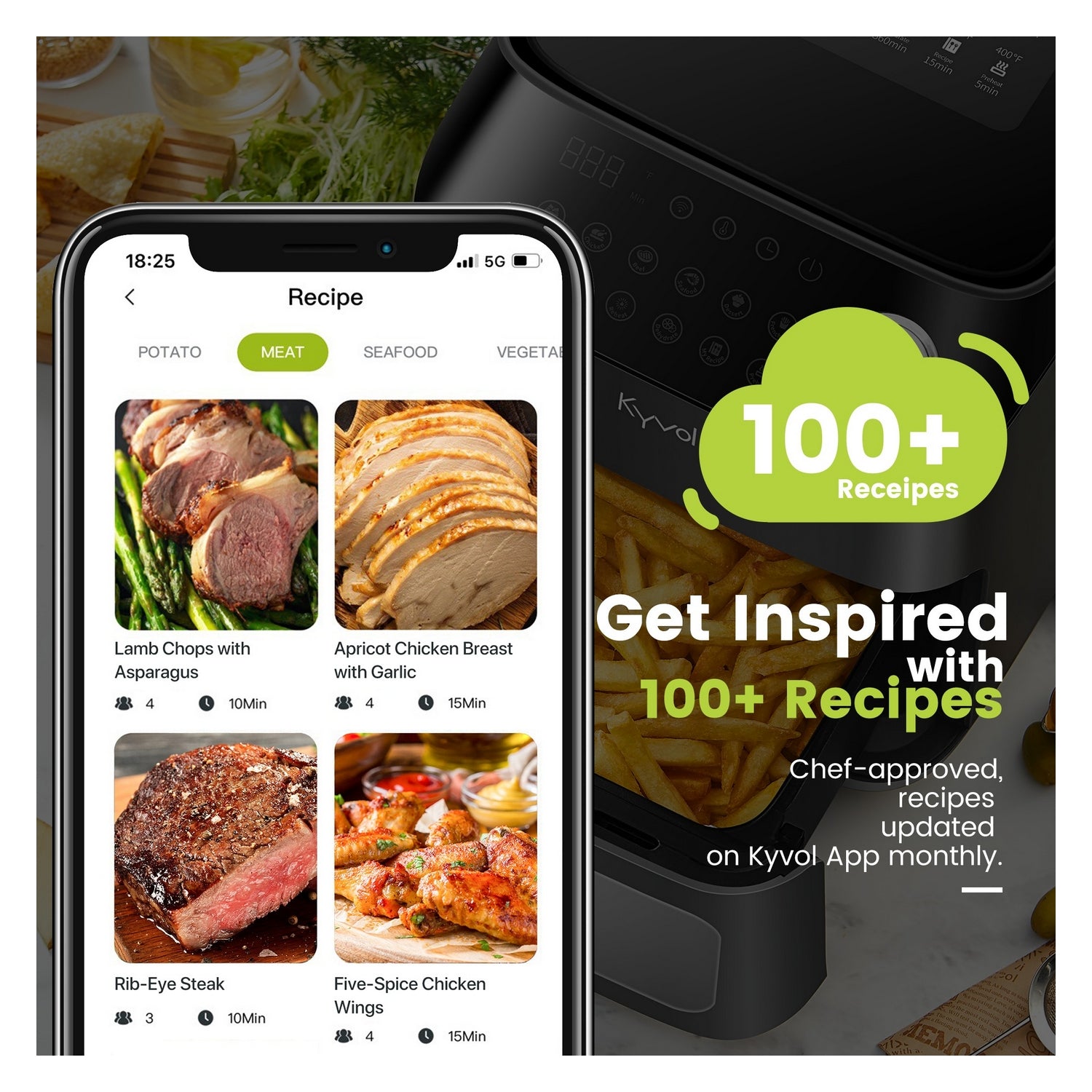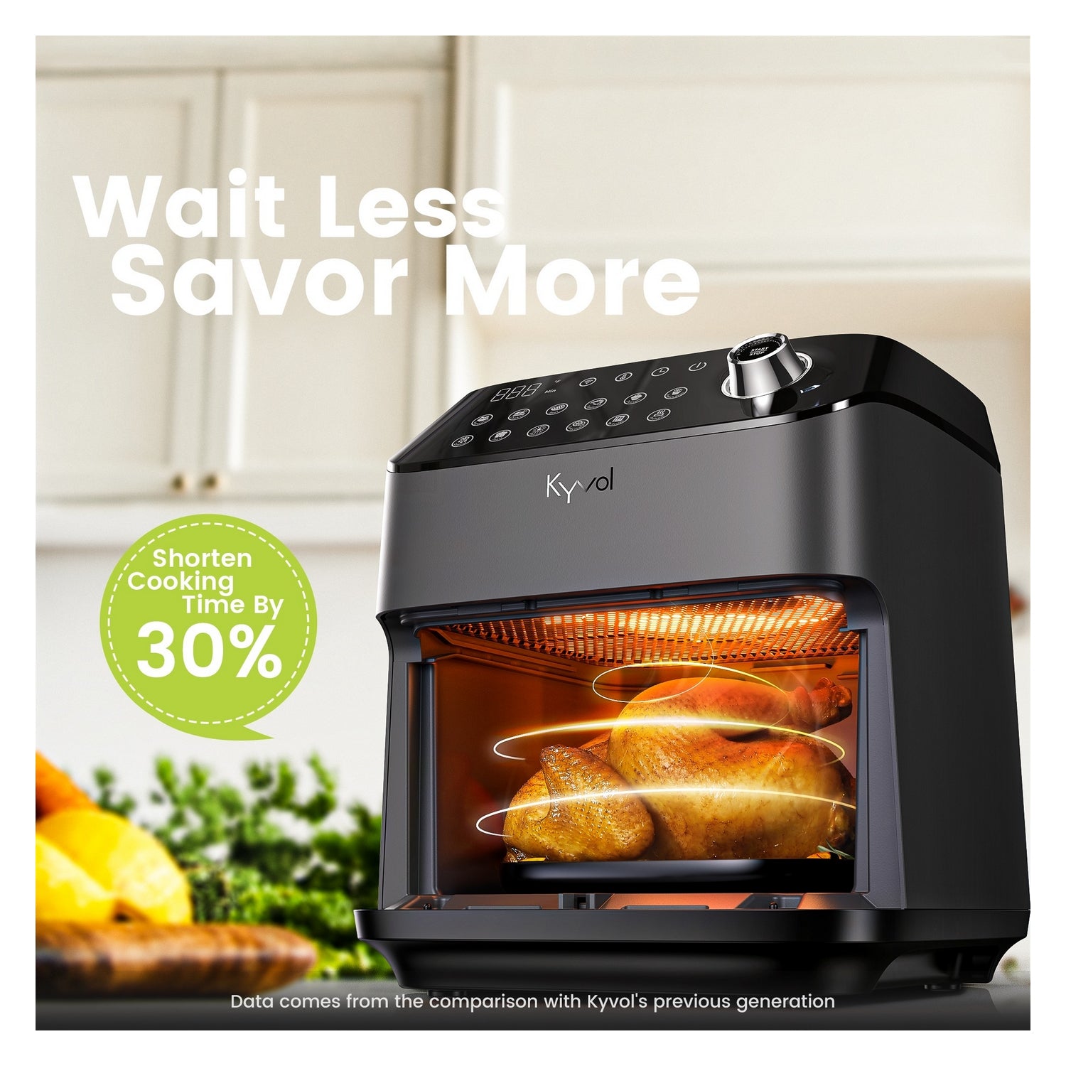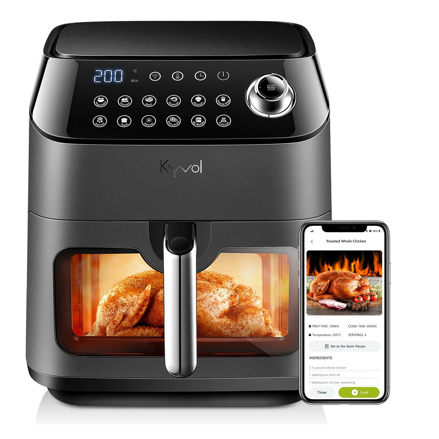 Prepare food with hot air instead of oil by using this Kyvol air fryer. It offers a temperature range from 105-400 degrees F to let you create dehydrated snacks or air-cook dishes with 85 percent less fat than traditional frying.