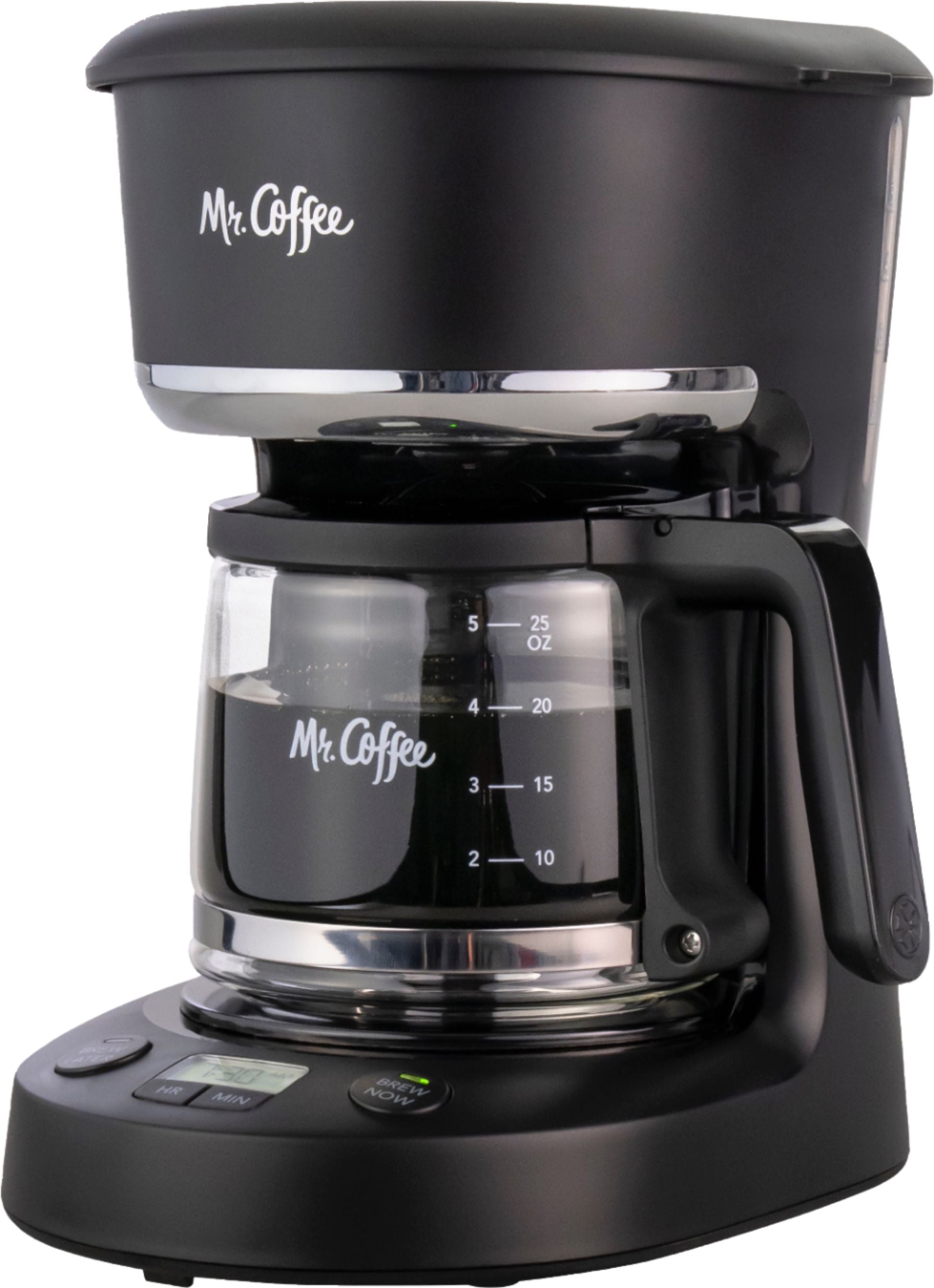 Start your day with a fresh cup of morning joe with this 5-cup Mr. Coffee programmable coffeemaker. The 25-oz. carafe is calibrated to ensure accurate measuring for hassle-free brewing, while the brew later function ensures a cup is ready when you need it. This Mr. Coffee programmable coffeemaker has an auto shutoff feature for enhanced safety.
