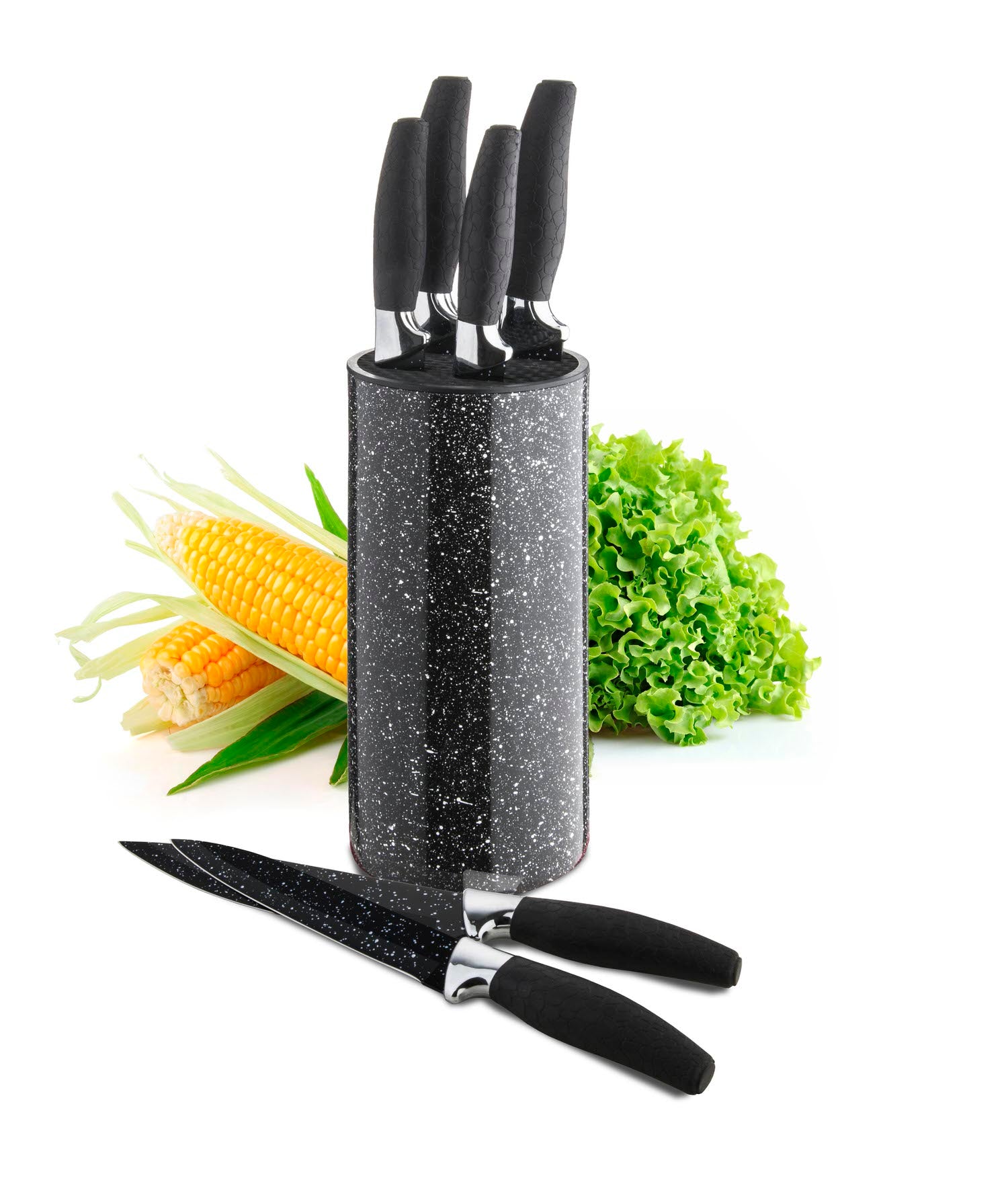 Made from superior high carbon stainless steel blades, with a strong, durable bolster. Tarnish and rust resistant. Works great by the grill, on the road and all your kitchen needs. Non slip ultra soft handles - ergonomic design provides comfort, perfect stability, control, precision and accuracy. High performance and quality blades; featuring a food safe slip-free marble finish coating. Razor sharp edge - heavy duty blades are extremely sharp and should be kept and stored in block when not in use.