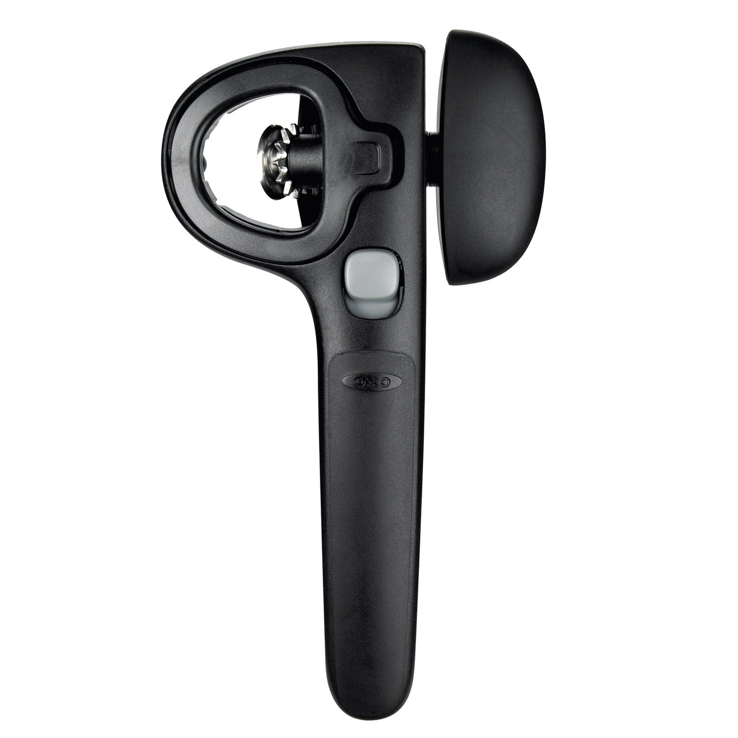 Hardened stainless steel cutting wheel turns smoothly Window to easily align Opener with can Non-slip handles Magnetic arm locks on to lid for no-touch removal Oversized knob