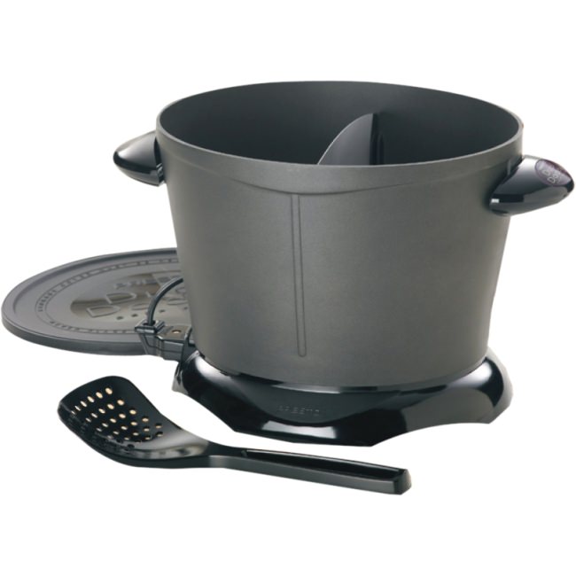 The ideal frying temperature is maintained automatically. No controls to set or watch. Slotted scoop lifts, drains, separates, and serves. Heavy cast aluminum with nonstick surface, inside and out, for quick and easy cleaning. Snap-on lid enables oil to be stored in the fryer to use again.