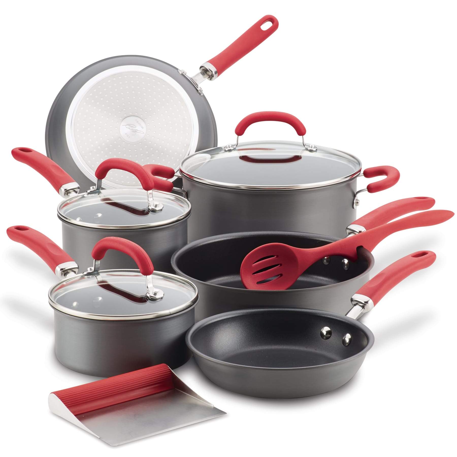 The Rachael Ray Create Delicious 11-Piece Hard-Anodized Aluminum Nonstick Cookware Set brings high performance and cooking convenience to home chefs eager for kitchen versatility with long-lasting dependability. Constructed from hard-anodized aluminum, this collection of essential pots and pans is enhanced with PlatinumShield Technology nonstick to be 9X harder than titanium for effortless food release. Colorful, dual-riveted stainless steel and silicone handles provide comfort and control that's oven safe to 400deg.F. The shatter resistant glass lids lock in heat and flavor while allowing foods to be monitored while they cook. Plus, this convenient nonstick cookware set features a unique ''swing lid'' that fits both the 5-quart Dutch oven and the 3-quart saute pan. Flared cookware rims make for easy pouring, and an induction-compatible stainless-steel base provides strength, durability, and versatility for use on any cooktop. Also included in the 11-piece pots and pans set is one of Rachael's signature food-moving bench scrapes and a slotted Lazy spoon that attaches conveniently to cookware rims to keep drips in the pan and not on the counter. From enhanced durability to superior PlatinumShield nonstick, reach for the long-lasting convenience of the Rachael Ray Create Delicious 11-Piece Hard-Anodized Aluminum Nonstick Cookware Set.