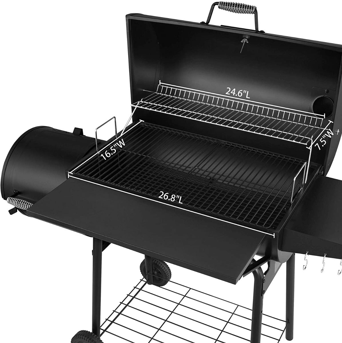 Royal Gourmet® Charcoal Grill with Offset Smoker is perfect for family use and even when having a few friends over. It is also ideal when you just want a simple BBQ on the offset smoker. Featuring a new painting process, the grill is resistant to scorching temperatures and will not easily flake off. 437 sq. in. porcelain-enameled cooking grates are durable, and you can regulate cooking temperature with 2-level adjustable charcoal pan. The swing-away warming rack provides secondary space; with a seamless combination of offset smoker, great heat and smoke circulation are guaranteed. A side door allows adding charcoal and cleaning ash easily. Open the air vent and stack, you can stock fire and transfer smoke effectively. Check internal temperature with built-in thermometer on lid. The spring handle protects hand from heat. Sitting on two durable wheels, it is convenient to move from place to place. Prepare delicious gourmet meals for your family with Royal Gourmet® Charcoal Grill with Offset Smoker, a compact and versatile appliance that can fit on most patios, balconies and decks with ease. Please note in order to prolong the longevity of grill, make sure the heat do not exceed 400℉ when barbecuing.