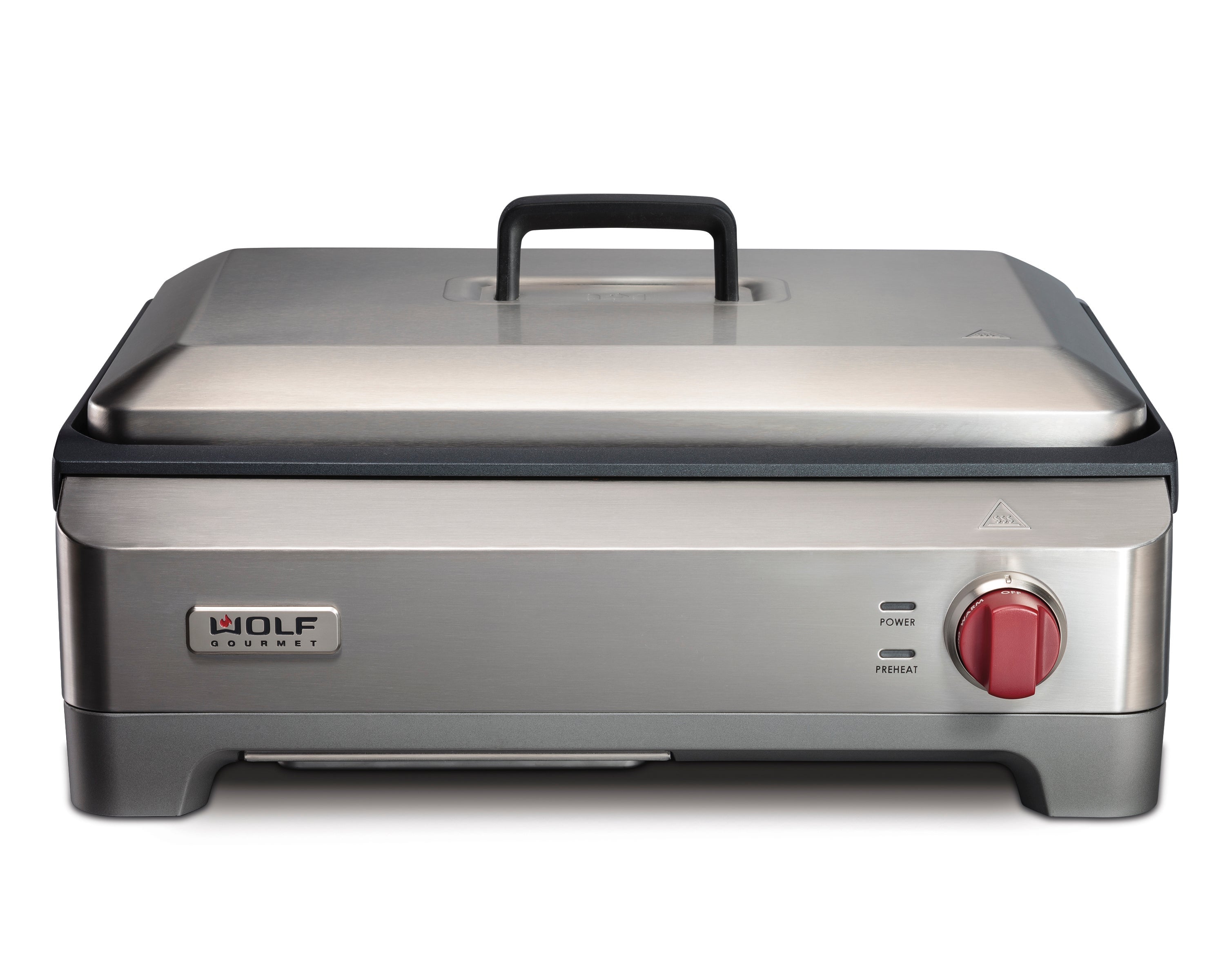 Stainless Steel Precision GriddleOne single appliance offers a wide variety of cooking options. Thick, cast aluminum cooking surface with advanced temperature control. Advanced temperature control - set between 150F-450F with precision control knob. Superior nonstick coating on surface with a 0.5" deep rim. Heating element is directly in the cooking surface. Vented lid with soft-grip handle. Integrated drip tray. Easy to clean with simple wipe away. 12" x 17" Cooking surface. Power and preheat lights. Power: 120V, 60Hz, 1800W. Dimensions: 17.625"W x 8"H x 17"D.
