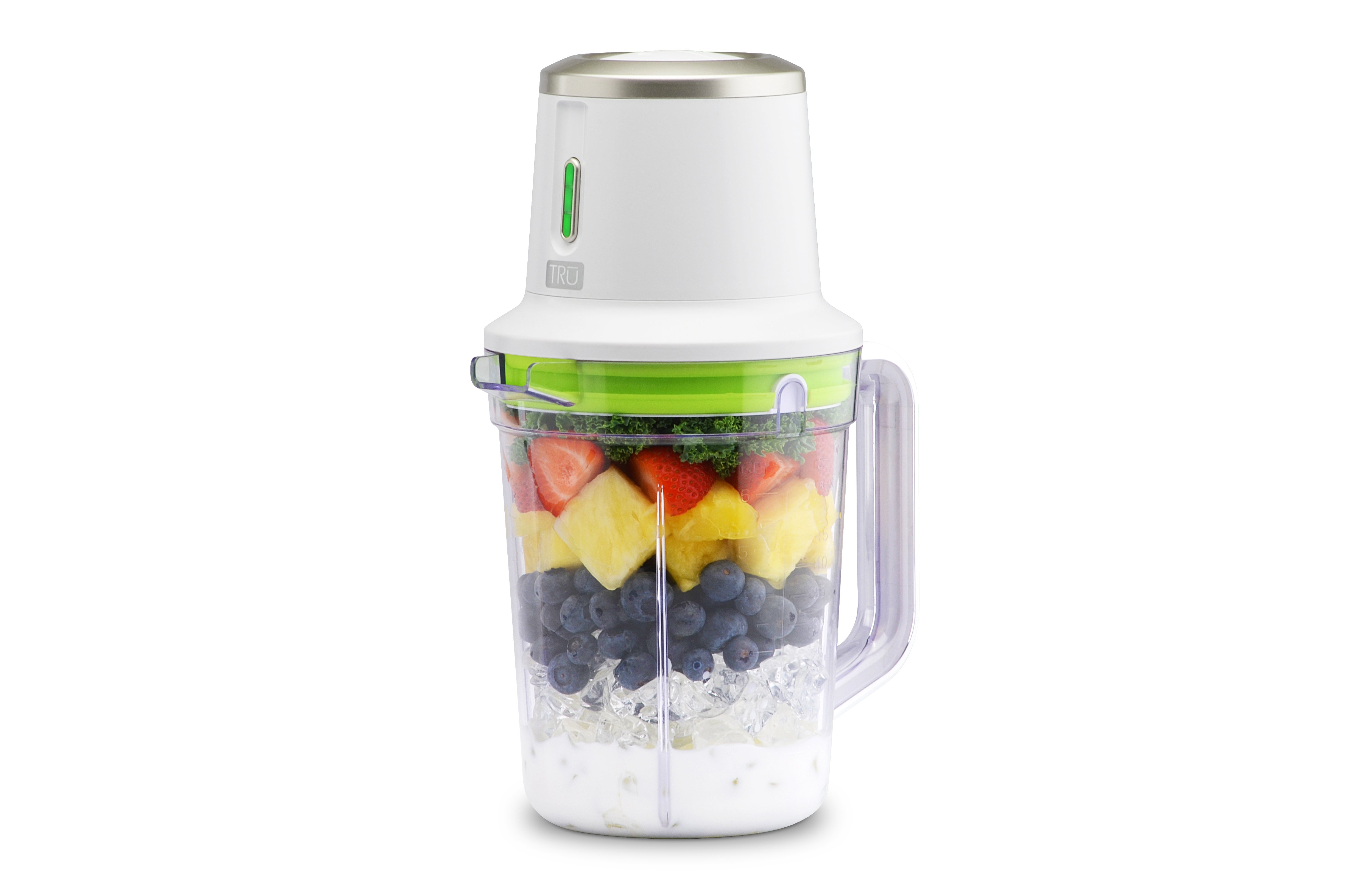 Make delicious smoothies and go all in one jar. Cordless design makes it easy to prep a snack or meal for the day. Powerful stainless steel cutting and chopping blade. Safety lock buttons. 2-Speed control. Charging port cover for safety. Built-in Lithium batteries for long lasting runtime. Plastic jar and lid.