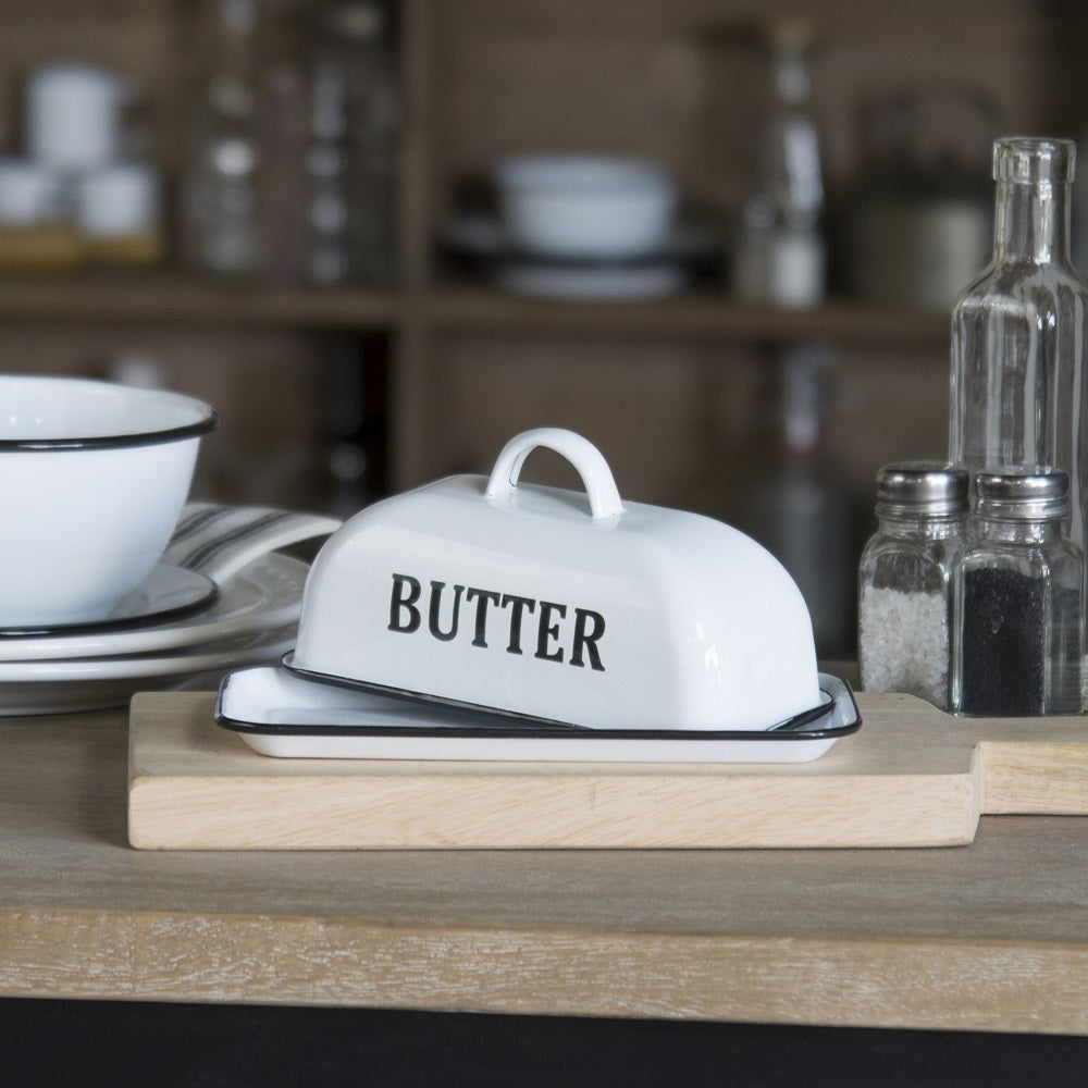 This butter dish is perfect for your kitchen. The white enamel and black letters will look perfect in any home. Store your butter stylishly in the fridge or on the counter.