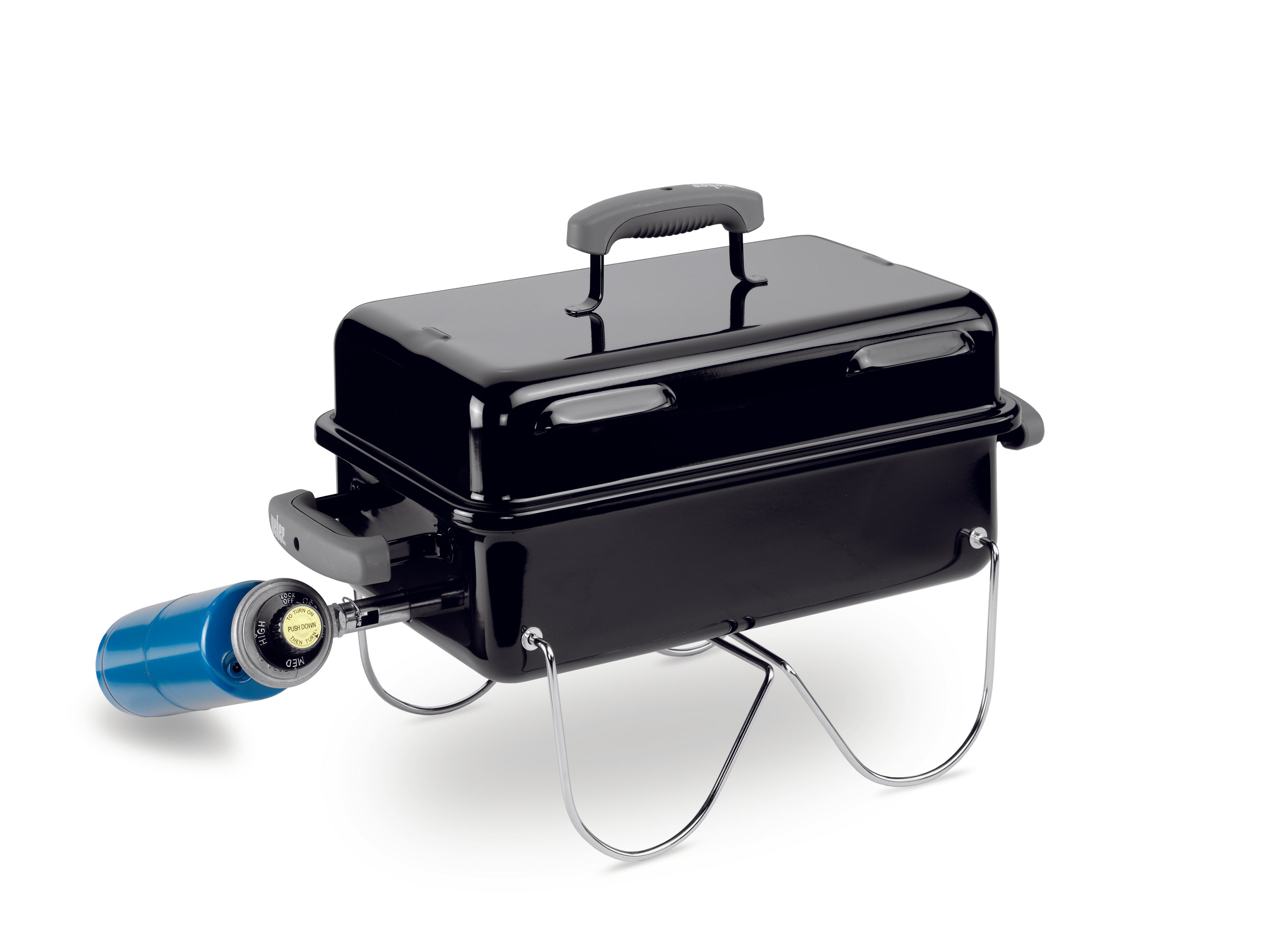 Enjoy the convenience of a Weber Gas Go-Anywhere grill while on the go. This gas grill with black porcelain enameled finish and three glass-reinforced nylon handles has legs that fold up to lock the lid in place for carrying and uses disposable LP cylinder (not included). Cooking area is 160 square inches. With the push of a button, our patented famous Flavorizer cooking system including plated steel cooking grate distributes heat evenly across the cooking surface.