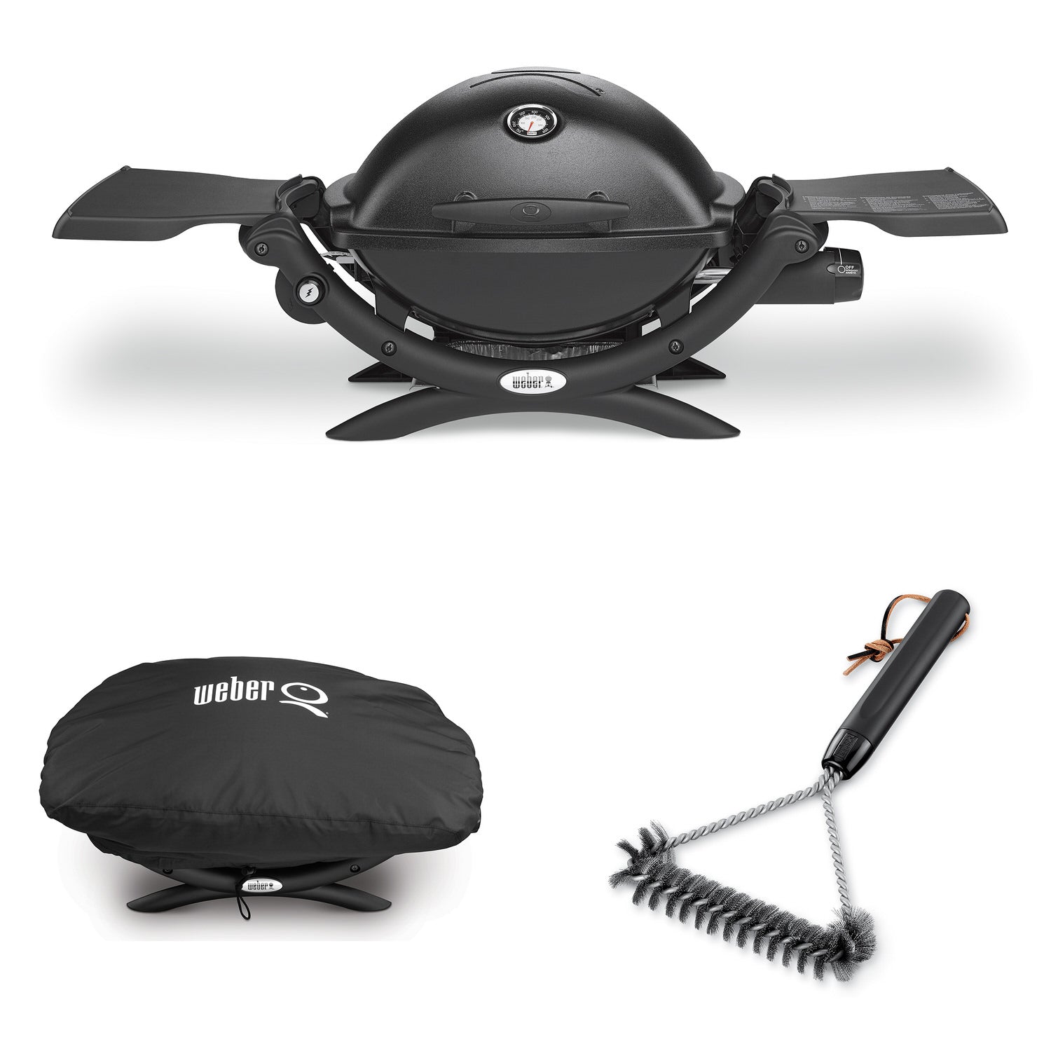 The Weber Q1200 gas grill is lightweight (24 lbs) and packs plenty of power. Perfect for camping and tailgating. Features a high-performance cooking system (8,500 BTU-ph/input), 189 sq. in. total cooking area, electronic ignition for reliable lighting and an infinitely adjustable burner valve with high-quality regulator. Cast-aluminum lid & body, large weather-resistant lid handle, porcelain-enameled cast-iron cooking grates, and 2 durable, tuck-away work tables. Removable drip tray allows for easy clean up. Std 14.1 oz LP cylinder (sold separately). Kit includes a Weber 2-piece Stainless Steel Tool Set and a 12'', Weber 3-Sided Grill Brush for keeping grill grates clean of food debris.