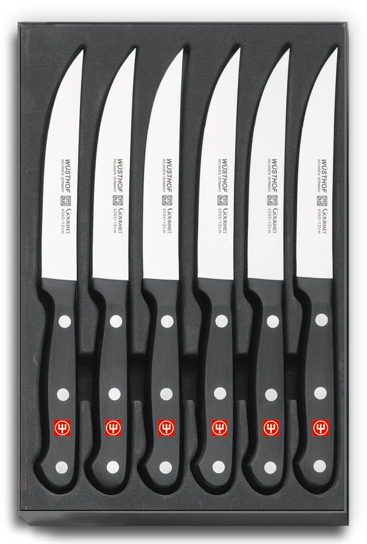 Set of six 4-1/2-inch steak knives. Stamped from high-carbon steel with a stain-resistant alloy. Synthetic polypropylene handles are triple riveted for durability. Precisely tapered from base to tip; no bolsters.