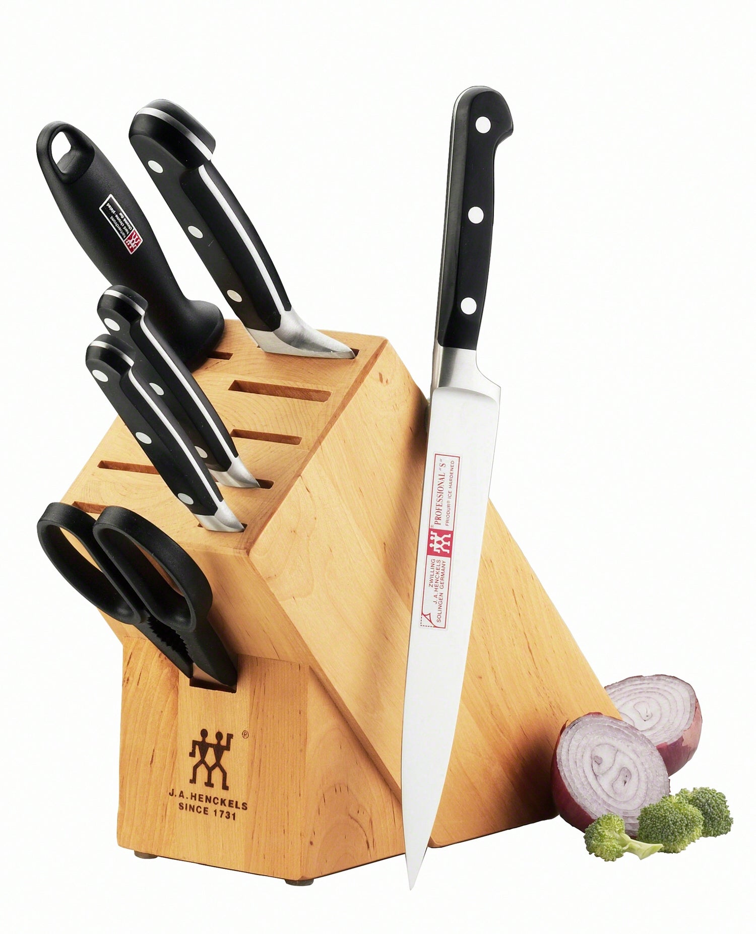 Made from a Zwilling special formula steel. SIGMAFORGE - forged from one single piece of steel. FRIODUR blade - hardened for long lasting sharpness and precision. Full tang with traditional three rivet handle. Full bolster and laser controlled edge. Edge handle 15-degrees on each side (10-degrees on Santoku). Made in Germany. Recommend hand wash to preserve finish. Includes: 3" Paring knife. 5" Serrated/Utility knife. 5" Santoku Hollow Edge knif. 8" Chefs knife. Kitchen shears. Sharpening steel. Hardwood storage block with steak knife slots.