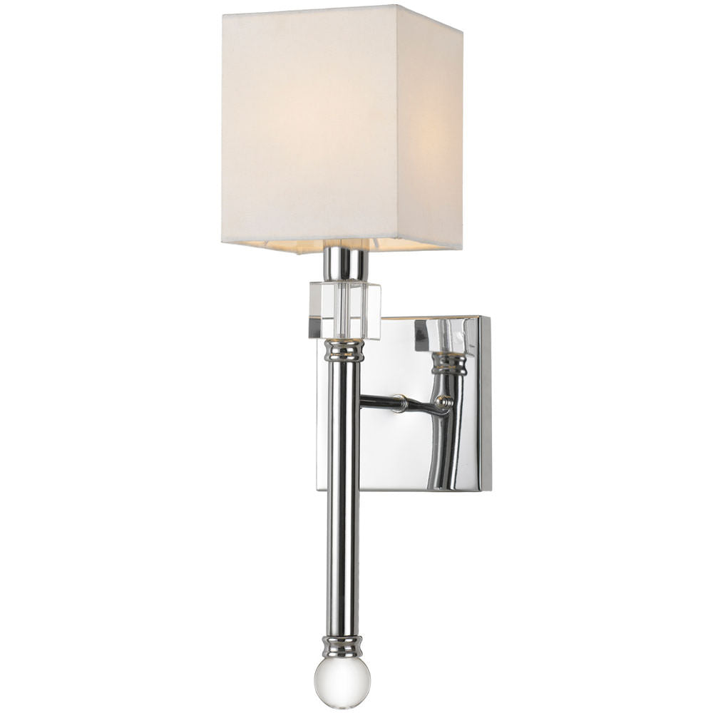 Illuminate your home with the Sheridan wall sconce from AF Lighting. This sconce provides the perfect blend of style and function; perfect for lighting up any hallway, entryway, and vanity. The frame is covered in a beautiful chrome finish that integrates well with existing color schemes. Two crystal ornaments are located in the center and bottom of the base. When the light is on, these crystals create a beautiful prismatic effect as the light shines through. The sconce is topped off with a square hardback shade in beige to complete the look.