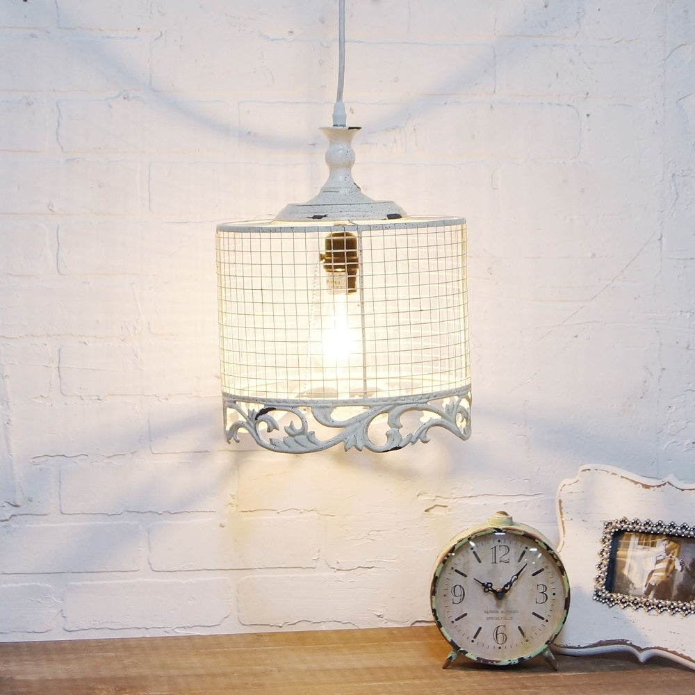 Create the shabby chic look with our small white pendant light. The distressed white metal cage is a twist on the traditional shade with a vintage look mixed with industrial flair. The ornate filigree surrounding the base adds an elegant sophisticated look. Add an Edison style bulb to maximize the effect.