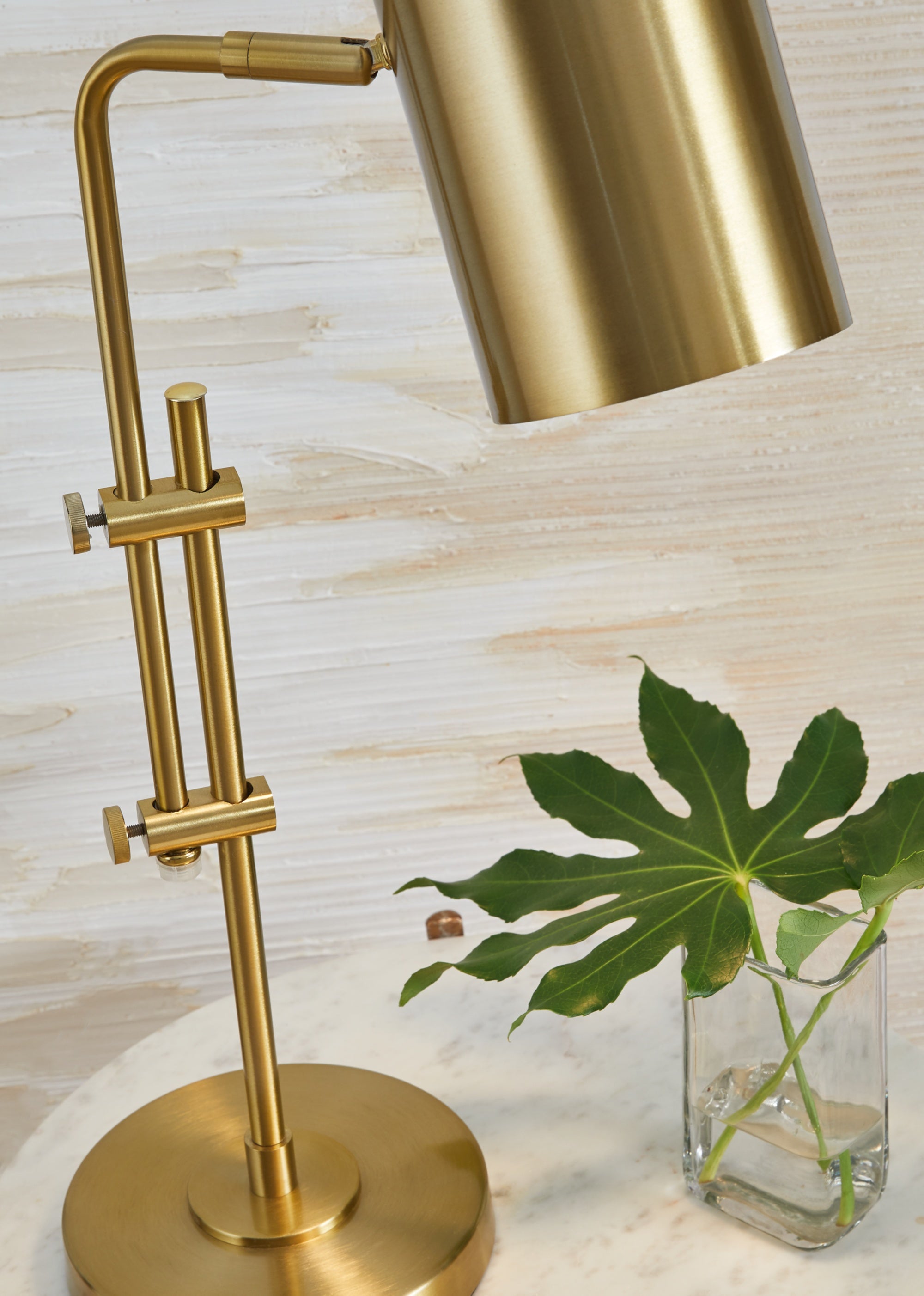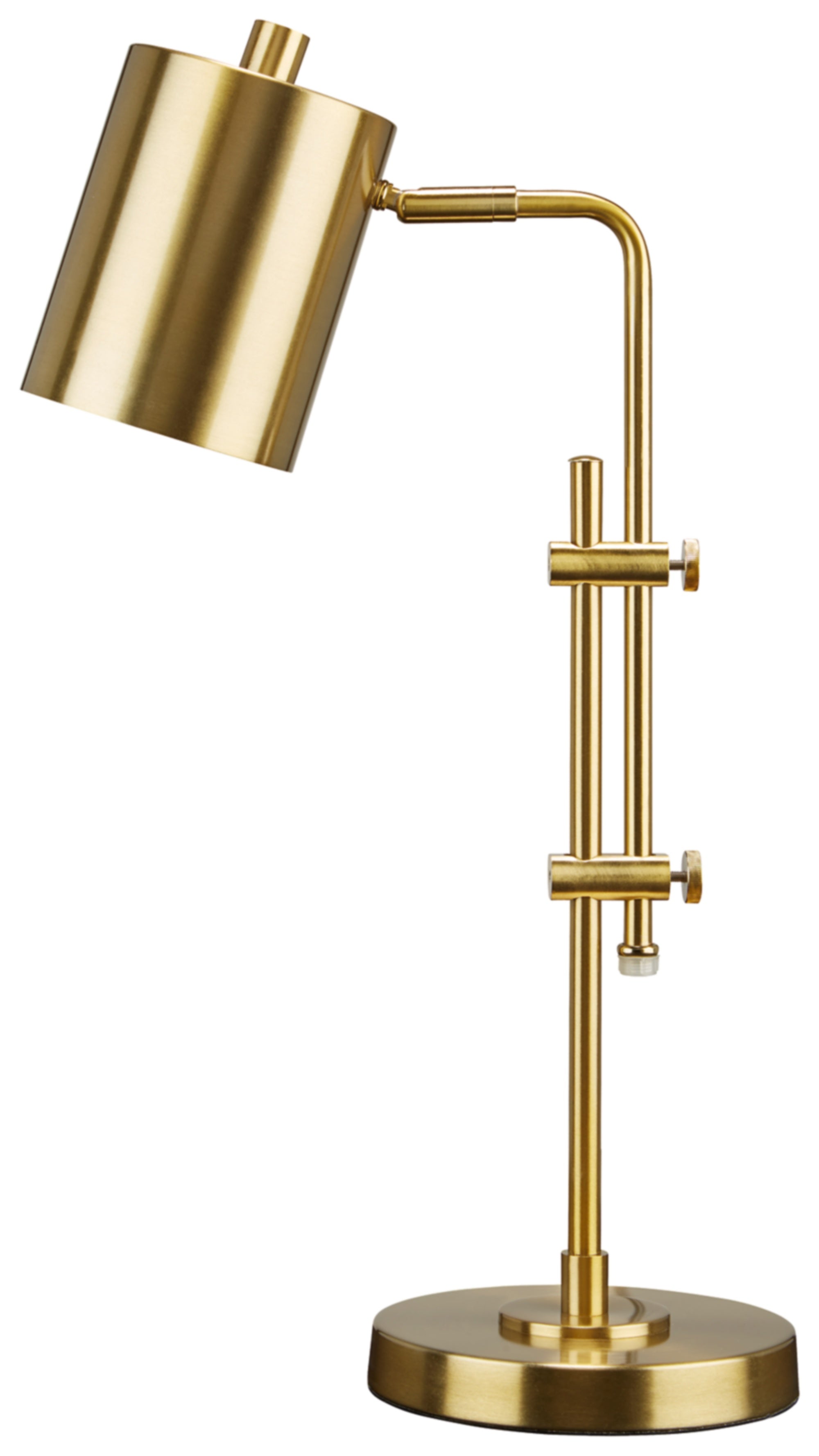 Inspired by contemporary lighting designs, the Baronvale metal desk lamp features a slender brass-tone profile with a simple metal shade. An adjustable neck and shade provide targeted illumination.