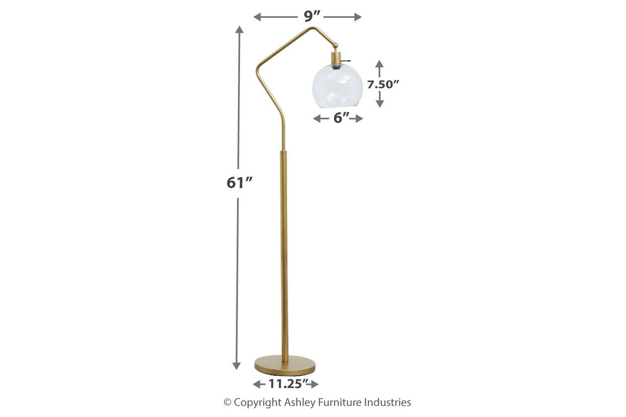 See light through a modern-day lens with this floor lamp. Antiqued brass-tone finish has the warm, eye-catching aesthetic you love. Glass shade hangs from a beautiful angular arm to illuminate your home.
