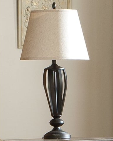 With an oil-rubbed finish base and linen-like shade, this table lamp complements virtually every aesthetic. Though neutral and versatile, this metal table lamp is anything but boring. Open-work design has an eclectic, one-of-a-kind feel.
