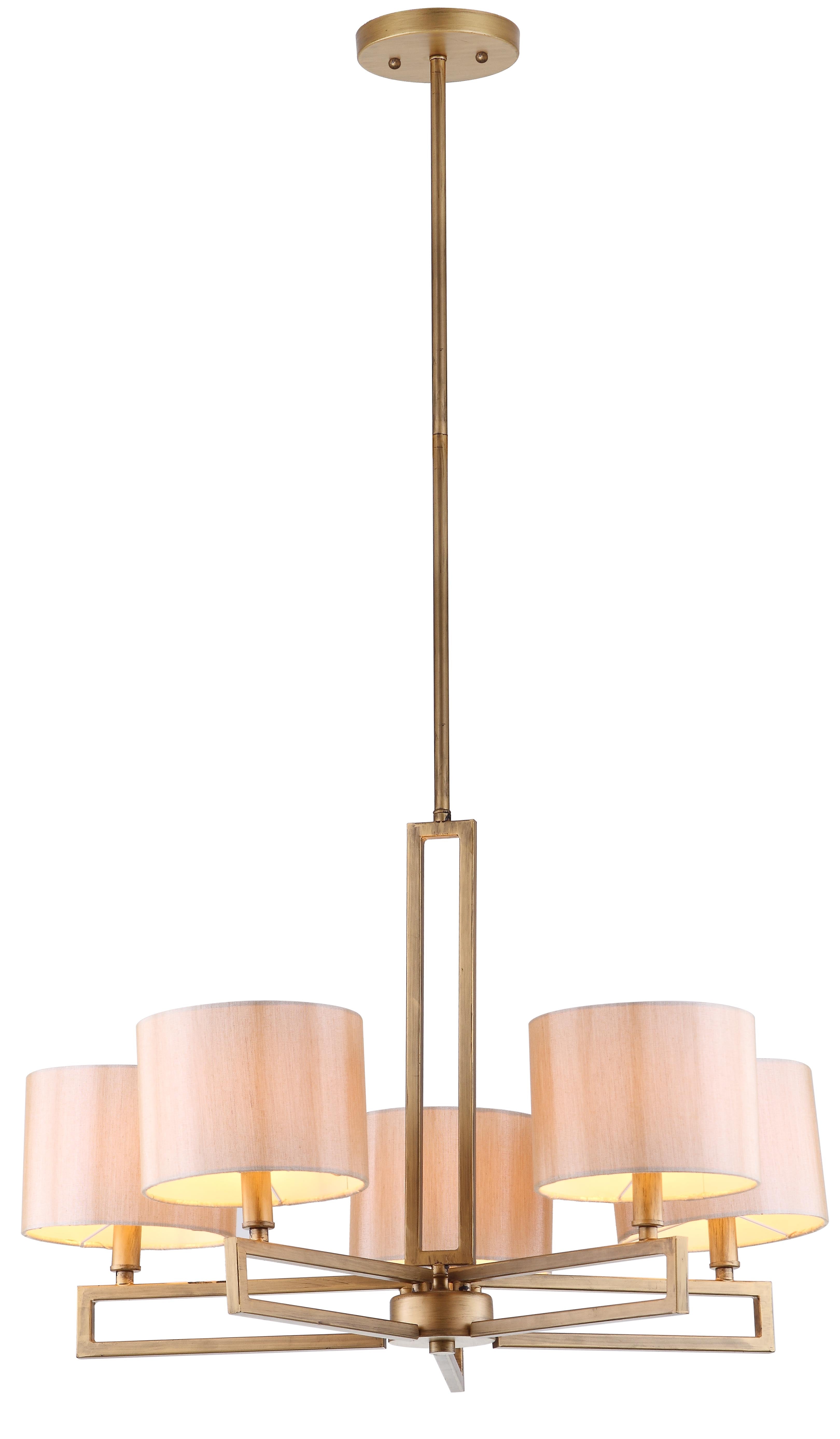 Contemporary meets Arts & Crafts style in the clean lines of the Renford Chandelier. This handsome five armed design is crafted of steel with an antique gold finish, paired with cream fabric shades for a room flattering glow.
