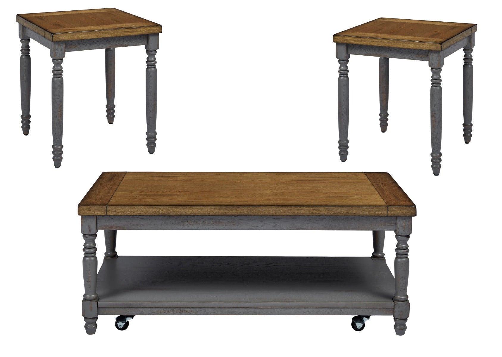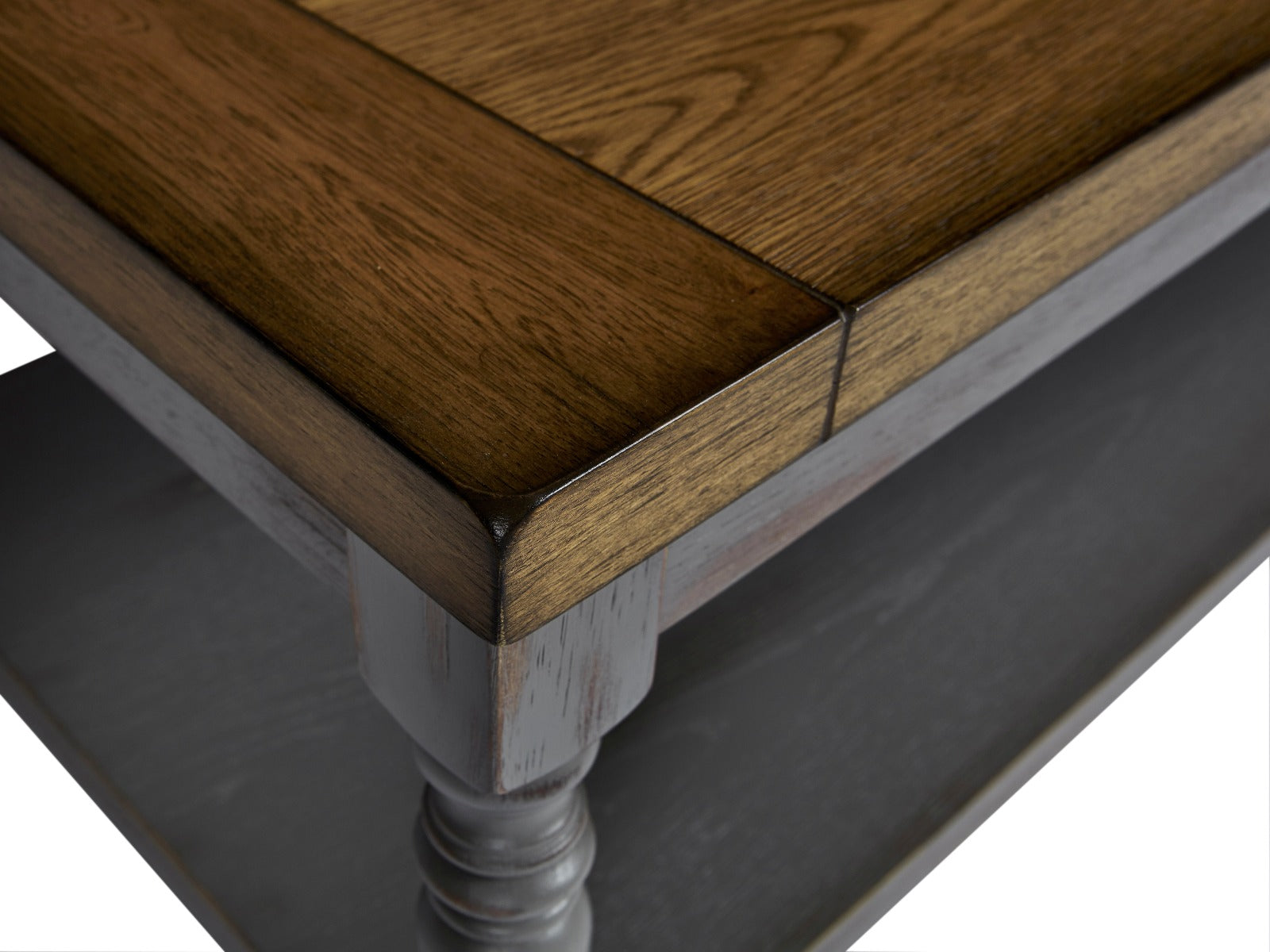 A great table group for the farmhouse style that we all love. The combination Oak and Brushed Gray finish is not only stylish but easy and will work with so many different fabrics, finishes, and colors. Gracefully turned legs are just the right touch to this simple beautiful design. Cocktail has a spacious bottom shelf for storage or display and also contains casters for ease of mobility.