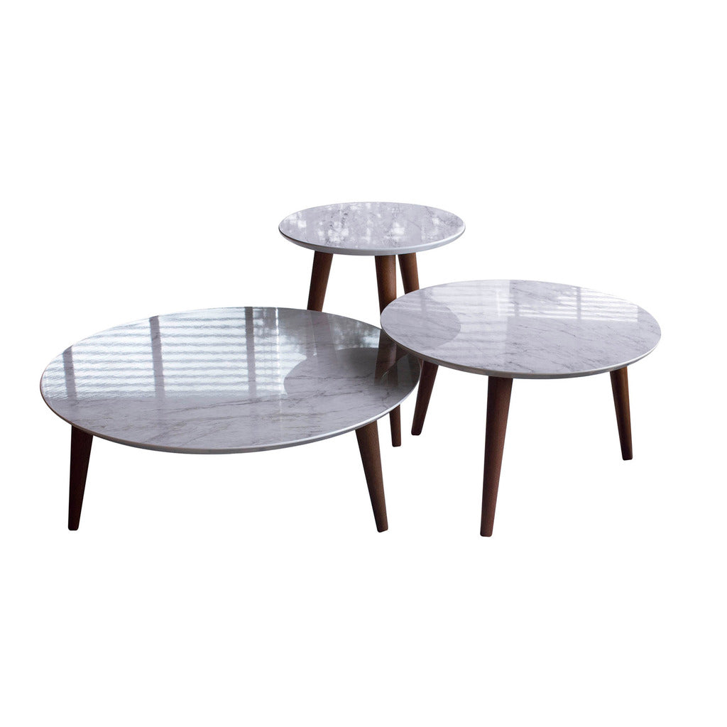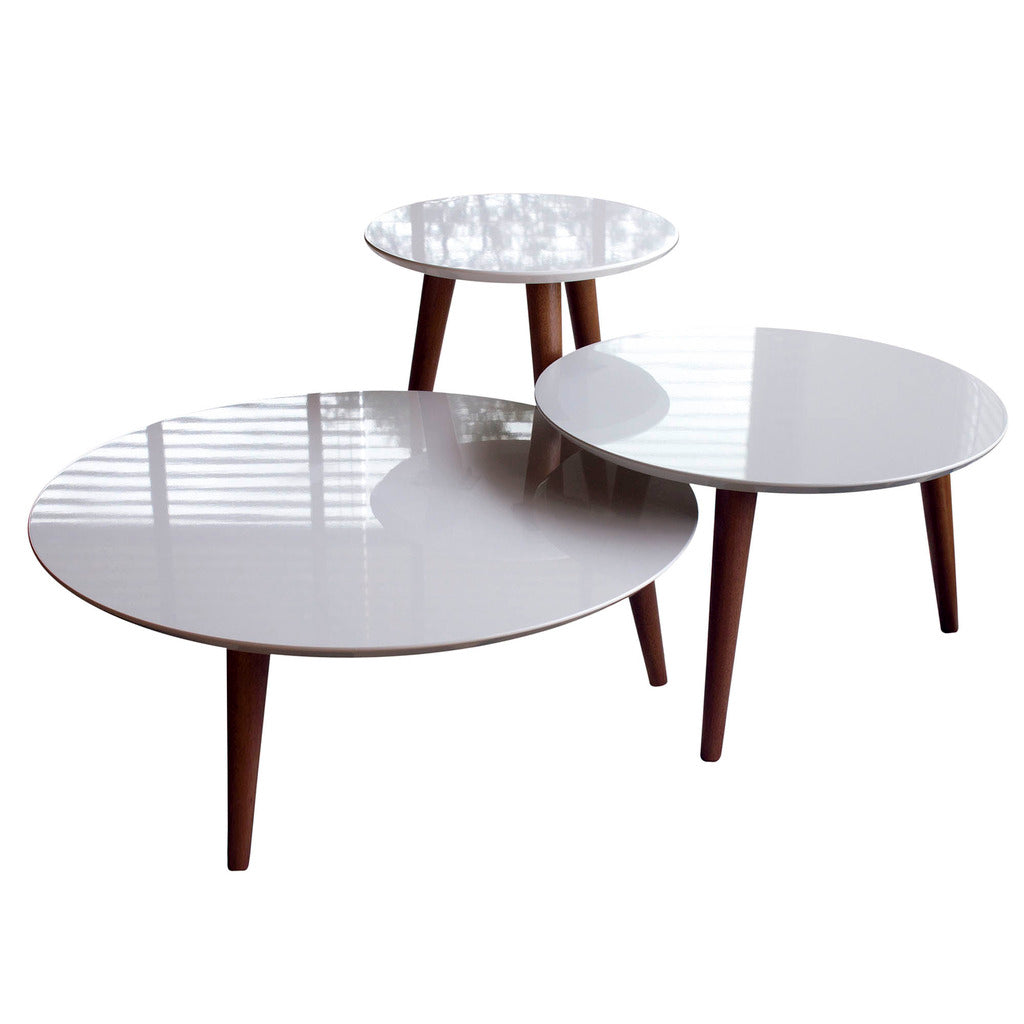 3-Piece Modern End Table Set for Living Room Use. * Tall Table Measures: 17.32 in. Length, 20.07 in. Height, 17.32 in. Depth. * Middle Table Measures: 23.62 in. Length, 14.96 in. Height, 23.62 in. Depth. * Short Table Measures: 31.49 in. Length, 11.81 in. Height, 31.49 in. Depth. * Geometric 3 - Leg Base Design. * Solid Wood Splayed Legs for Fashion Statement Design and Product Durability. * Made of High Quality MDF with Painted Smooth Gloss Finish. * Minor Feet Assembly Required. All Hardware Included.