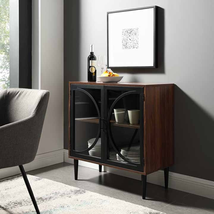 With distinct decorative door fronts of tempered glass and metal, this multifunctional accent console gives both storage space and a stylish addition to any room. Set near a wall in your living room as an accent console, in your kitchen as a storage cabinet for your fine china, or as a bar cabinet with your drinks and glassware, as the shelf is adjustable to fit your items. Held up with mid century modern tapered legs, this piece incorporates both an industrial chic look and transitional style for an on-trend element in your home.