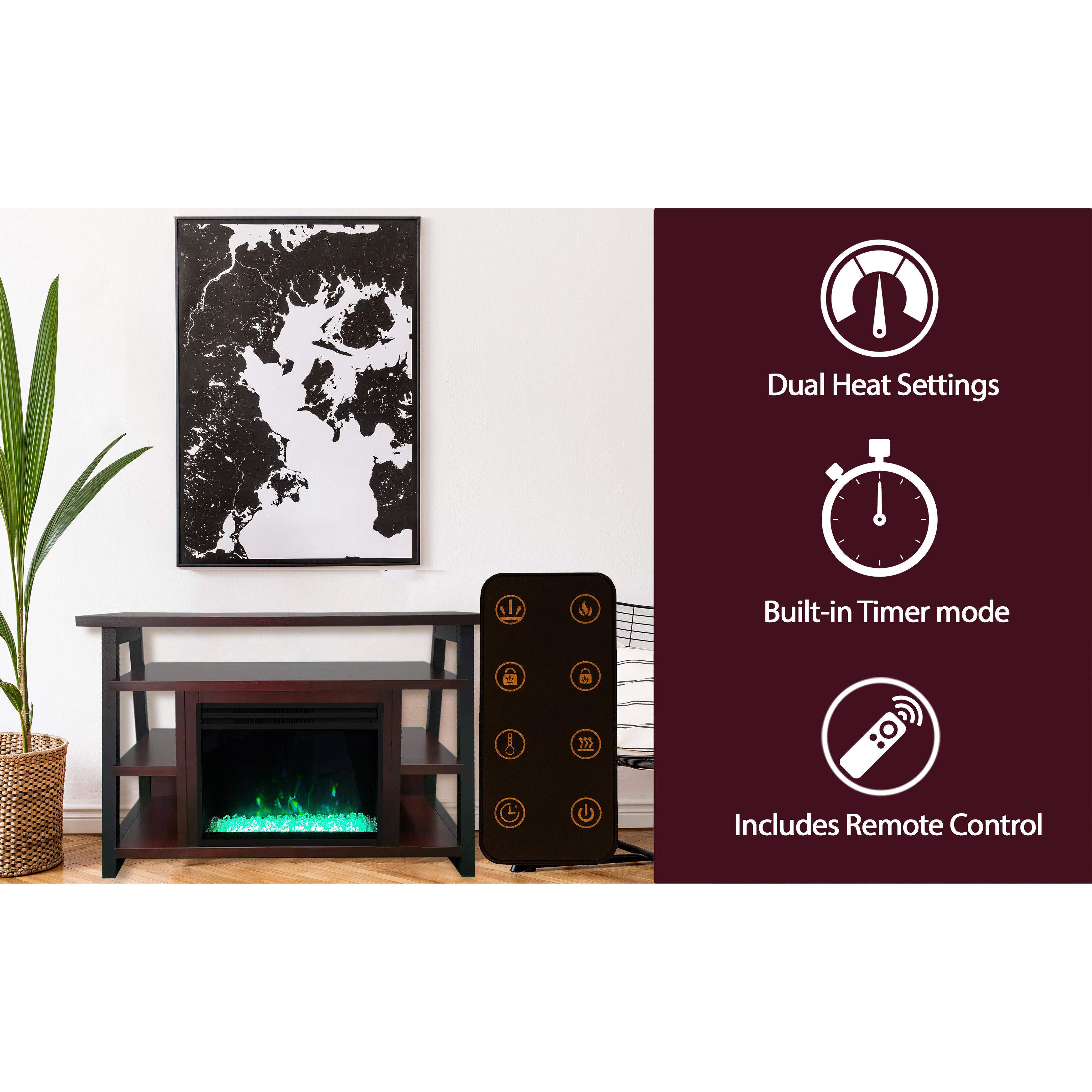 Dive into your industrial style with this modern Sawyer Electric Fireplace Mantel. The fireplace is paired with an enhanced, deep crystal insert and a color changing flame display to allow for your home to have the feel of a real fireplace without the hassle and maintenance of one. The dual heat settings can be adjusted accordingly for both warmth and energy saving purposes. The fireplace can be used with or without heat, so you are able to enjoy the ambiance of your fireplace all year round. This mantel is styled with metal accents and an industrial chic design will accent any contemporary household decor. It includes a remote controller for your convenience in adjusting the settings from across the room. Two people are recommended to assemble this electric fireplace and TV stand. Keep cozy without sacrificing time or elegance with this Shelby Electric Fireplace Mantel from Cambridge!