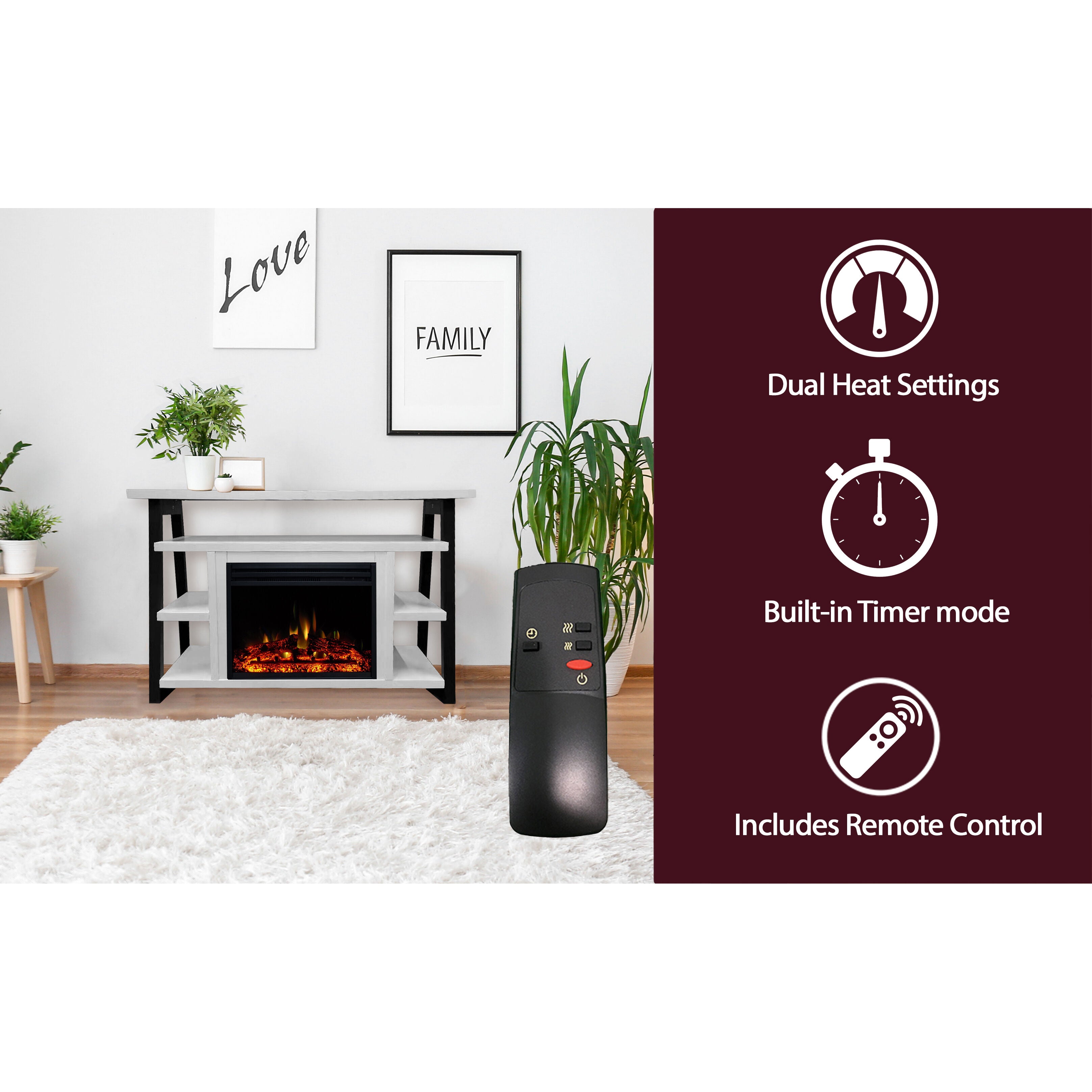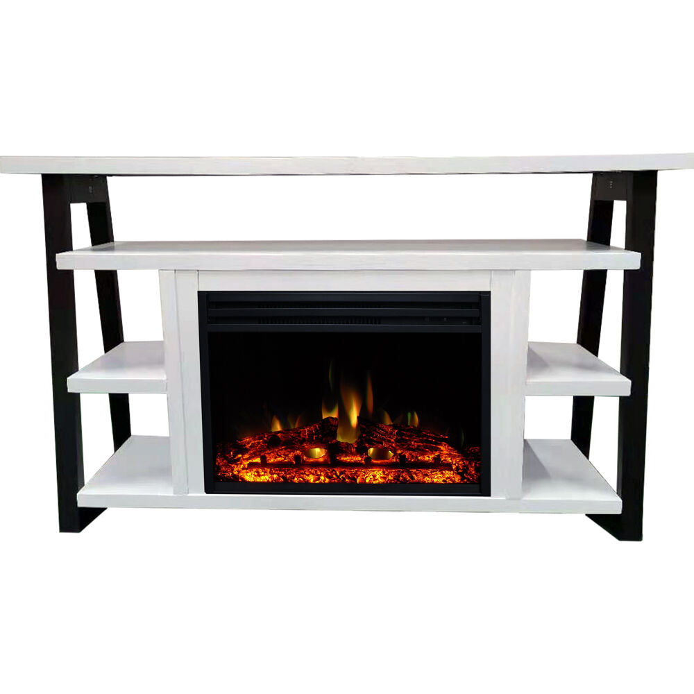 Dive into your industrial style with this modern Sawyer Electric Fireplace Mantel. The fireplace is paired with a deep, enhanced log and a color changing flame display insert to allow for your home to have the feel of a real fireplace without the hassle and maintenance of one. The dual heat settings can be adjusted accordingly for both warmth and energy saving purposes. The fireplace can be used with or without heat, so you are able to enjoy the ambiance of your fireplace all year round. This mantel is styled with metal accents and an industrial chic design will accent any contemporary household decor. It includes a remote controller for your convenience in adjusting the settings from across the room. Two people are recommended to assemble this electric fireplace and TV stand. Keep cozy without sacrificing time or elegance with this Shelby Electric Fireplace Mantel from Cambridge!