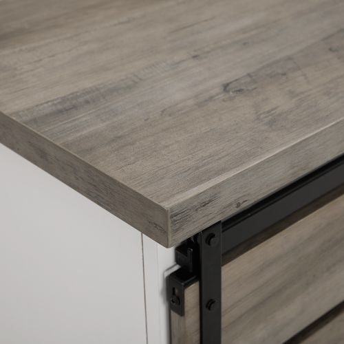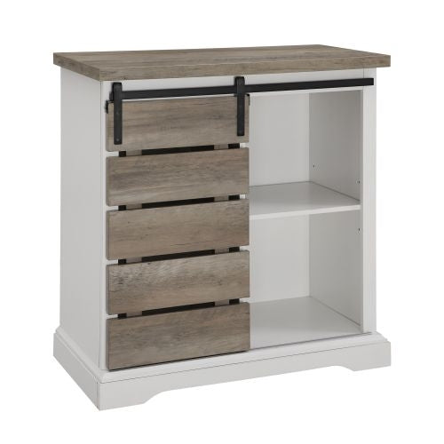 Compliments will come your way after you add this stylish TV stand into your home. Drawing attention with its two-tone finish, which offers a fresh and modern new take to a rustic farmhouse appeal. Featuring a sliding slatted door front to glide smoothly over either side, keeping your items hidden on one side and open on the other. This wood TV stand provides adjustable shelving to organize your media, books, electronics, decor, and more the way you like it. Create that charming farmhouse feel by incorporating it in your living room as an entertainment center, bedroom as a storage cabinet, or kitchen as a buffet. Made of high-grade MDF, durable laminate, and metal.
